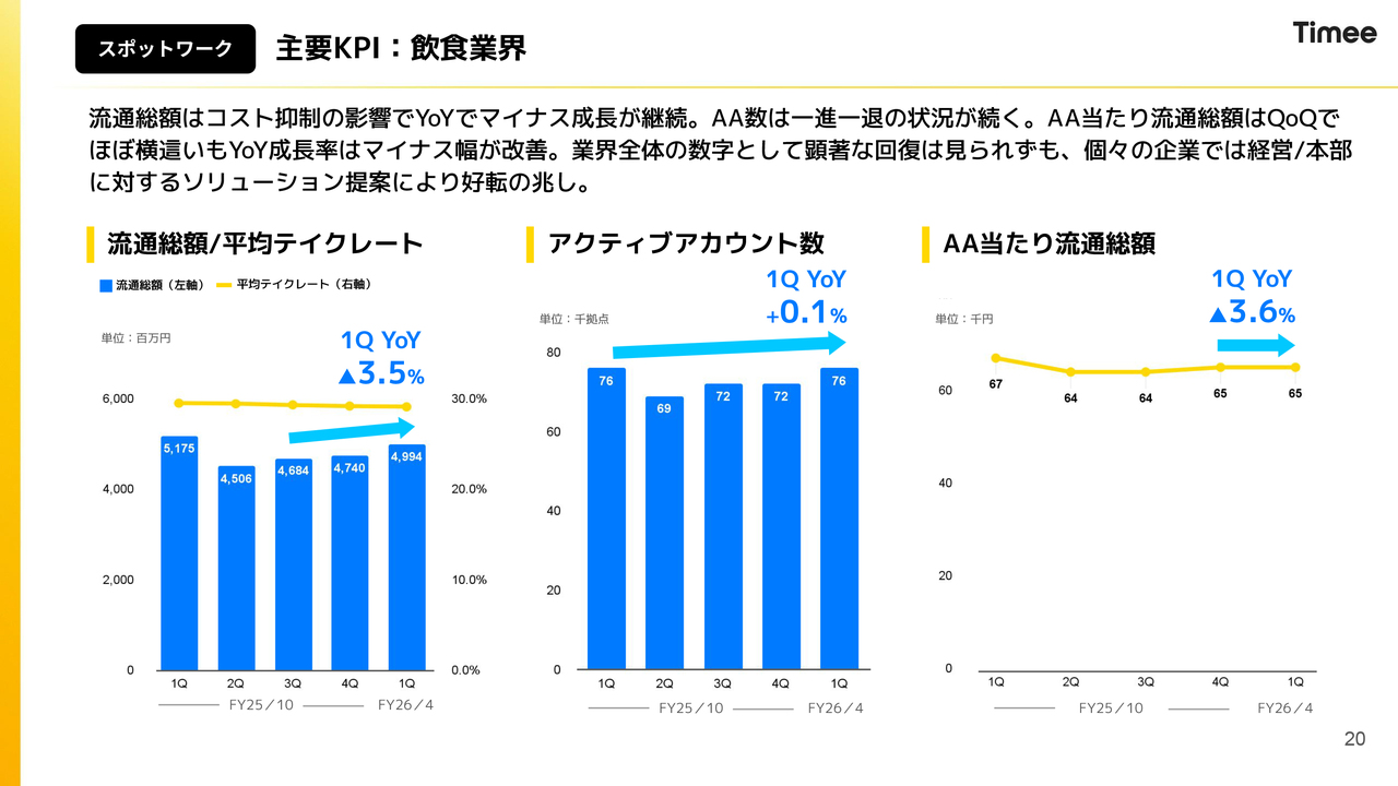 飲食業界については、マイナス成長が続いています。しかし、アクティブアカウント当たり流通総額についてはマイナス幅が着実に改善しており、底入れ反転の兆しが一部見られるのではないかと思っています。