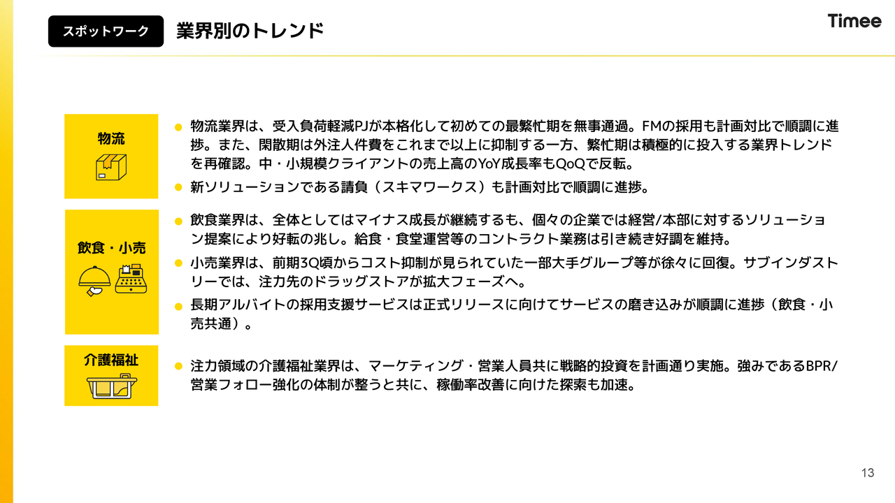 スポットワークに関して、業界ごとのトレンドをお伝えします。物流業界については、好調に推移しています。前期第4四半期においては、業界環境や慣習の変化により、やや弱含んだ状況が見られました。