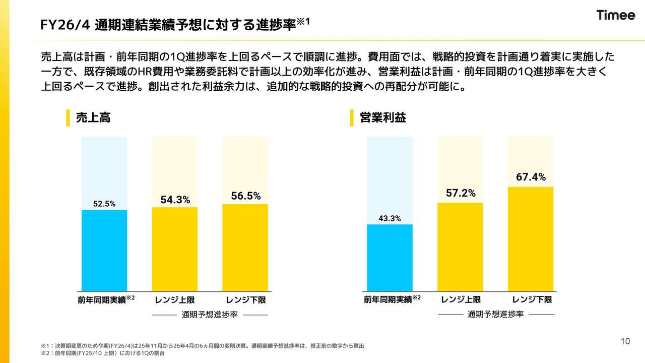 連結業績予想に対する進捗率です。売上高と営業利益はいずれも好調に推移しています。特に利益については、コスト効率化がしっかりと寄与し、進捗率はレンジの上限、下限ともにプラスとなっています。