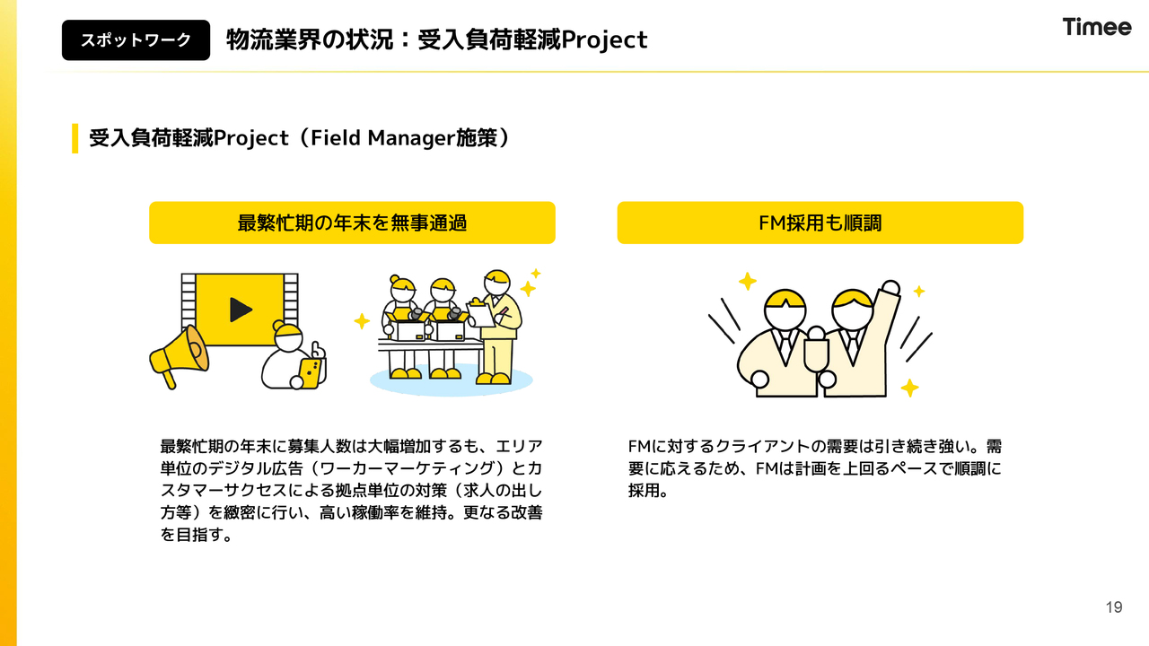 Field Manager施策については、第1四半期の最繁忙期に向けて、約半年前から準備を進め、お客さまとしっかり交渉を重ねてきました。その結果、人手不足が顕著に現れる年末も無事に通過しました。現在は、Field Managerの採用も順調に推移しています。