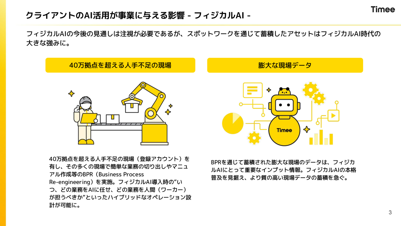タイミー上では、接客に関連するホスピタリティ業務が多岐にわたっています。接客スキルが高い人材に関する情報が蓄積されつつあり、これらはロボットでは代替できない、人が行うべき業務の領域で当社の強みとなると考えています。
