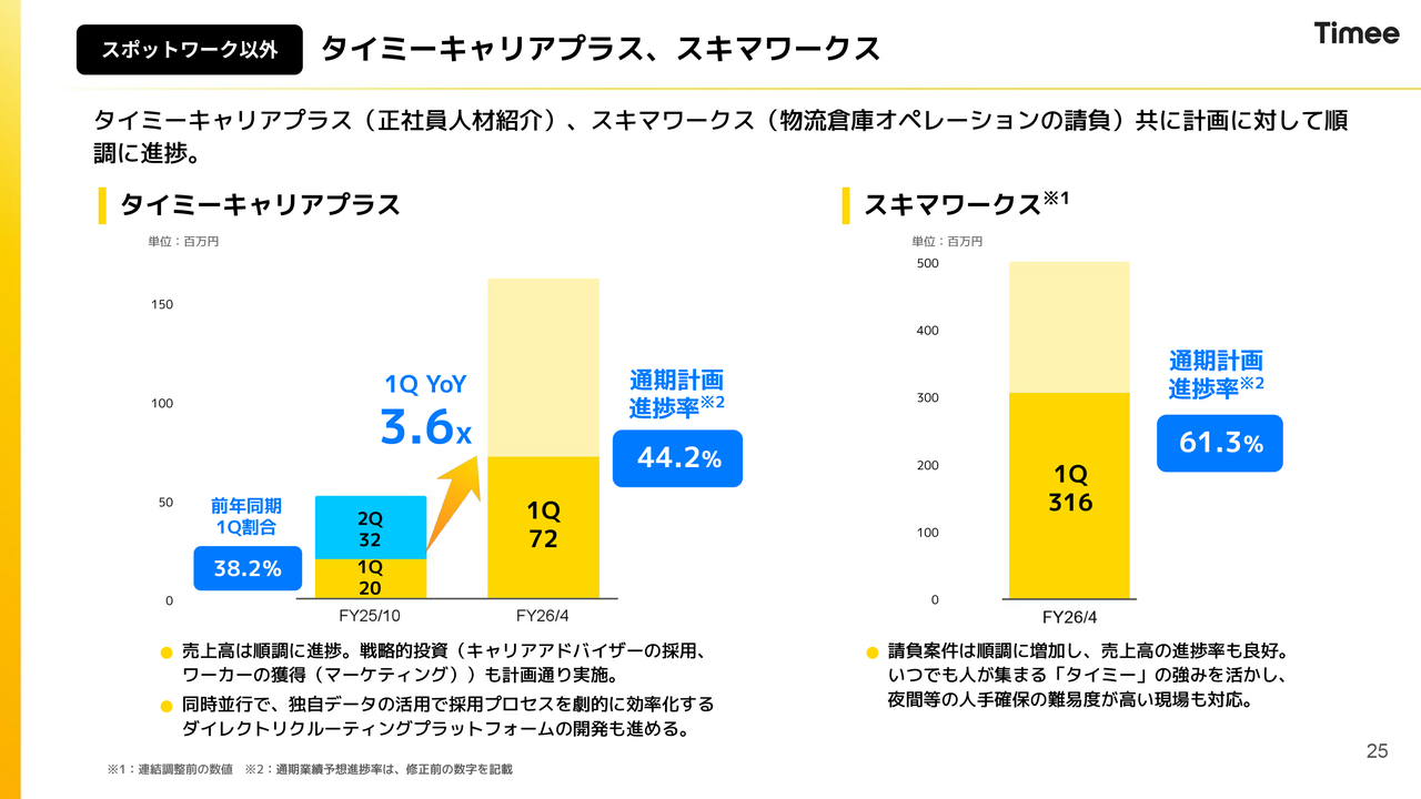 「タイミーキャリアプラス」と「スキマワークス」についてです。これらの新規事業に関しては、比較的順調に進んでいます。「タイミーキャリアプラス」は正社員の人材紹介事業で、前年同期比で現在3.6倍の成長を遂げています。