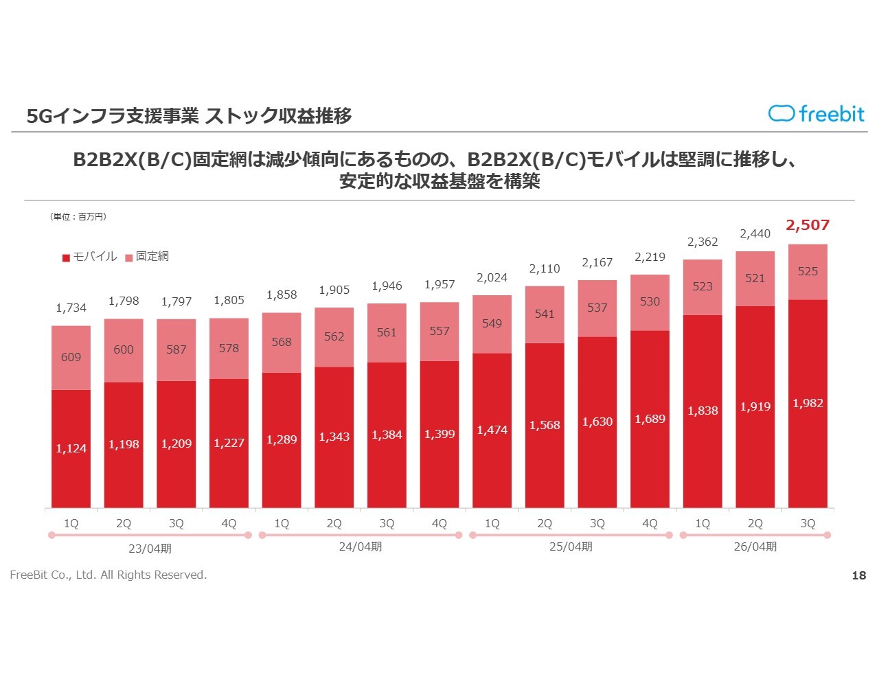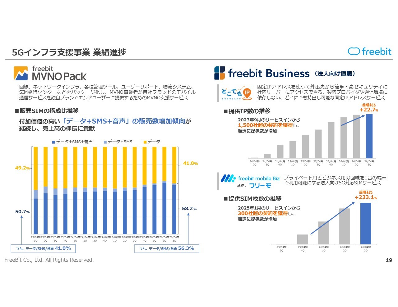 「freebit MVNO Pack」については、「データ+SMS+音声」の販売数増加傾向が継続し、ストック収益の推移を踏まえて順調に拡大しています。