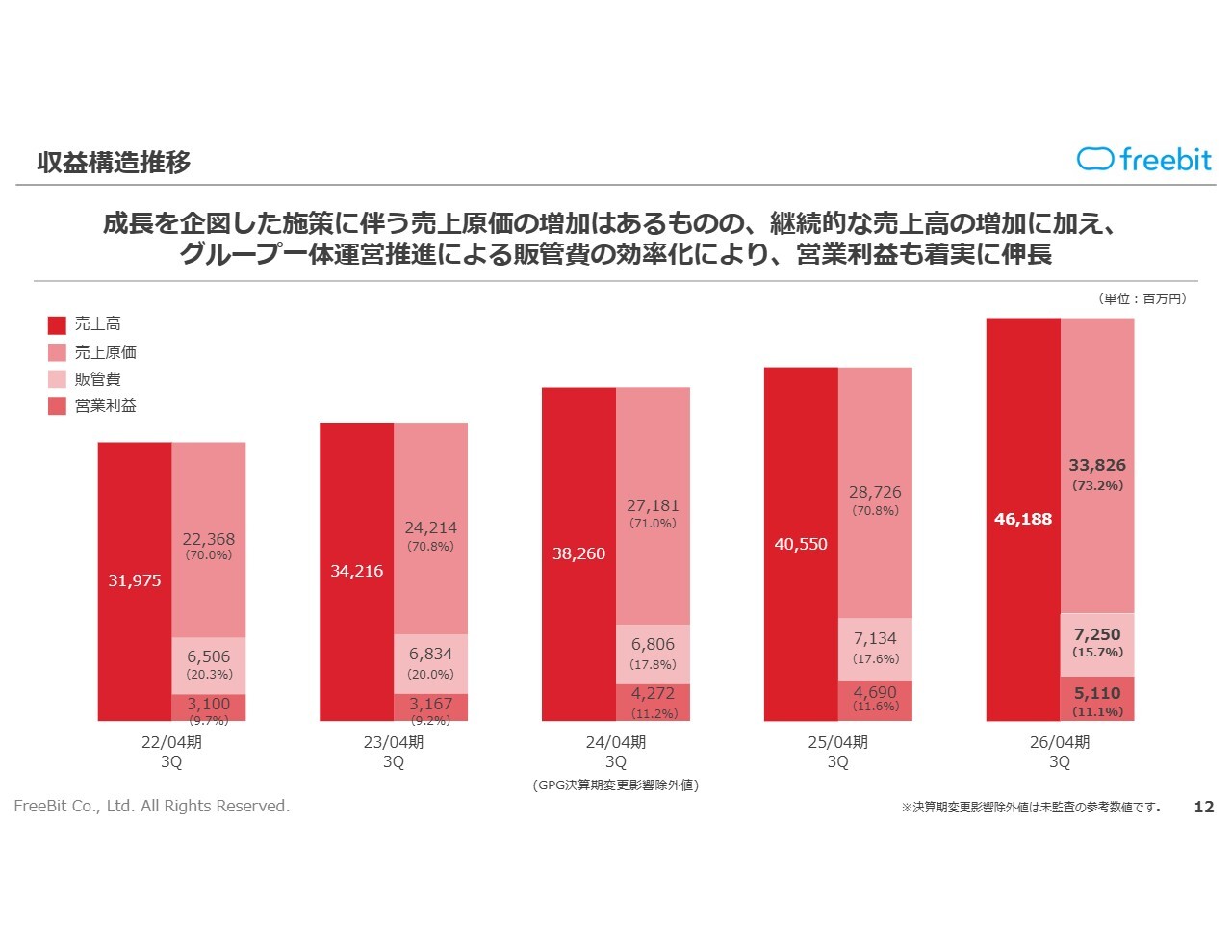 収益構造の推移です。スライドをご覧いただくとおわかりのとおり、売上高は大きく伸びています。それにあわせて売上原価が増加しているものの、グループ一体運営推進による販管費の効率化も進めています。結果として、営業利益は着実に伸びている状況です。