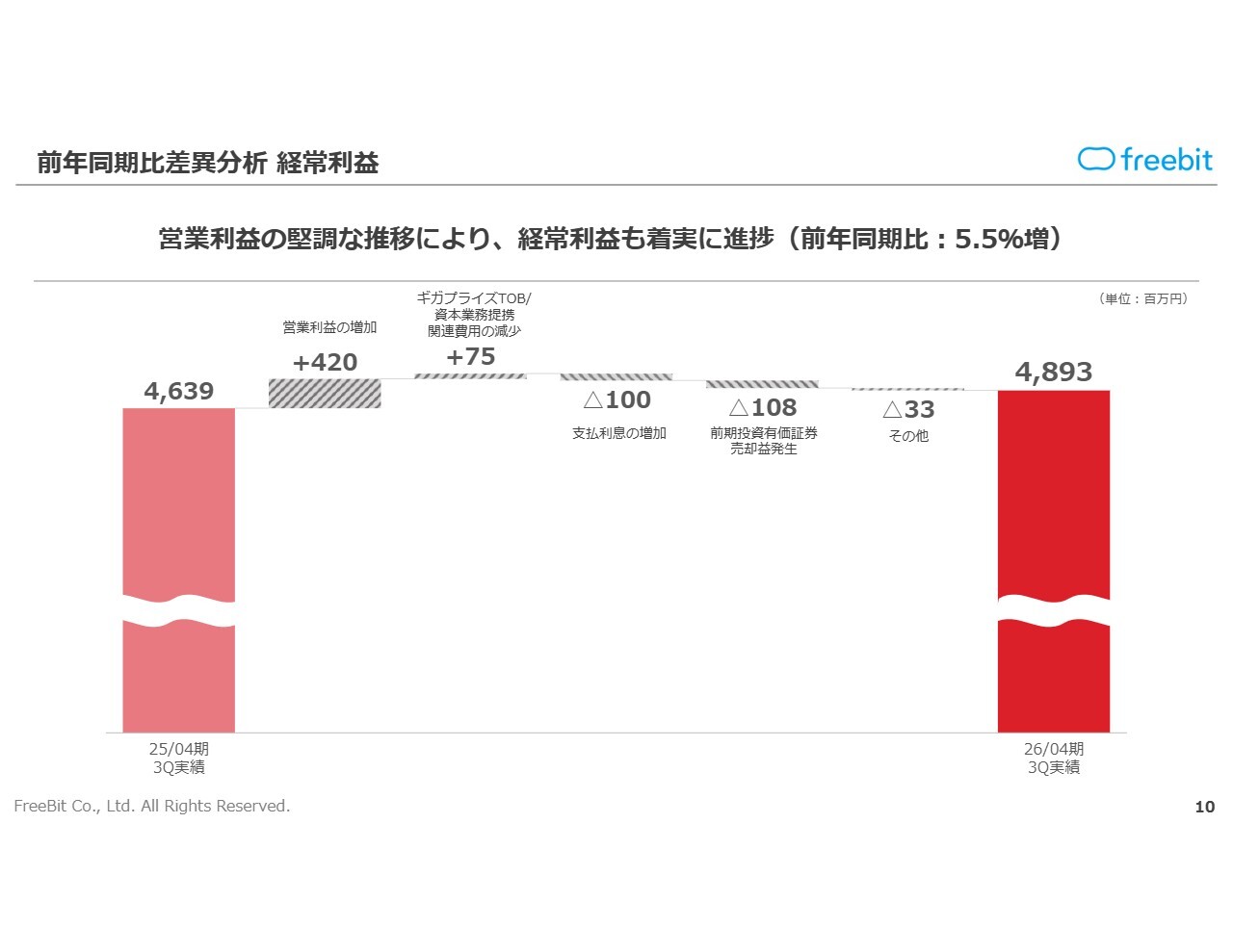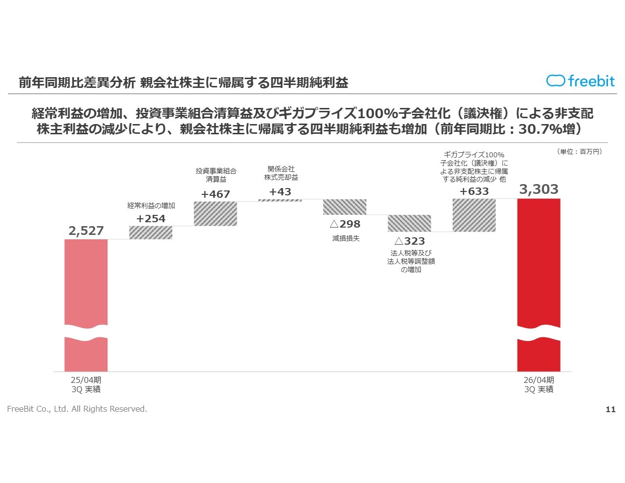 親会社株主に帰属する四半期純利益については、投資事業組合清算益や減損損失といった一過性の特別損益が発生した一方で、前期に実行したギガプライズの100パーセント子会社化により前年同期比でプラス6億3,300万円となりました。こちらは継続的な効果が期待できると考えています。