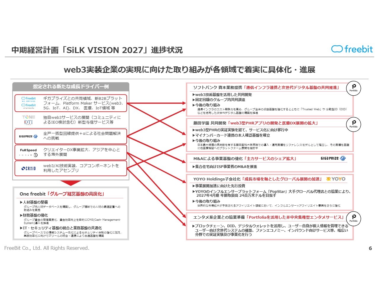 また、2026年4月期については、web3実装企業に向けたグループ一体の取り組みも併せて進めています。「One freebit」というテーマのもと、「事業力・稼ぐ力向上」においてはソフトバンク株式会社(以下、ソフトバンク)との提携を始動しています。