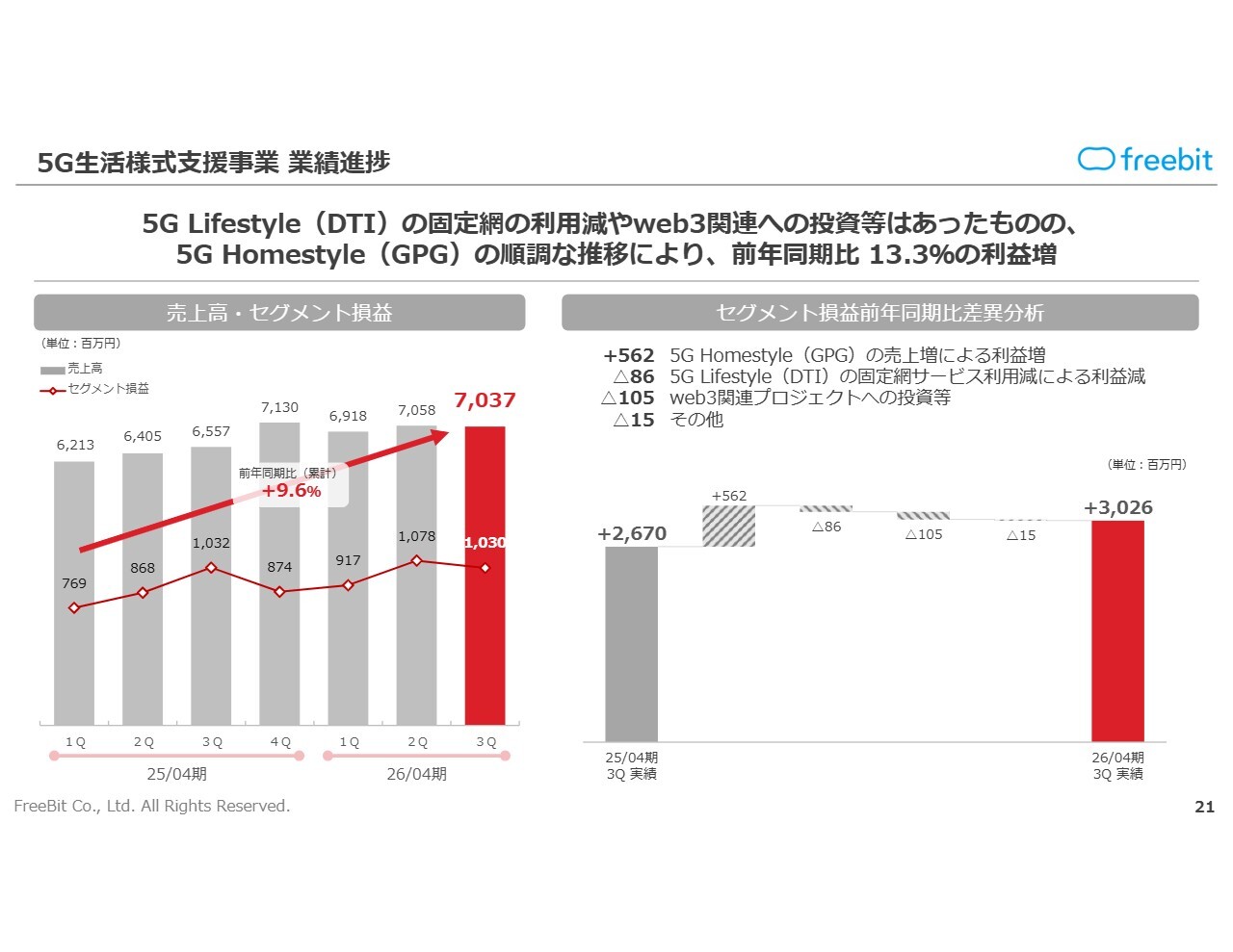 DTIを中心とした「5G Lifestyle」の固定網の利用減が続いています。また、web3関連への投資は発生していますが、ギガプライズの事業である「5G Homestyle」が順調に推移したため、前年同期比13.3パーセントの利益増となり、30億2,600万円で着地しています。