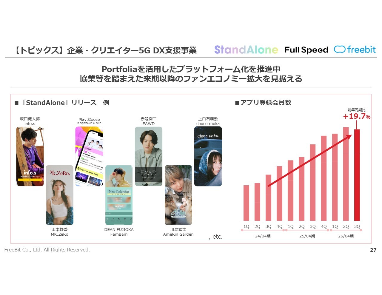 「Portfolia」を活用したプラットフォーム化を目指し、「StandAlone」事業を展開しています。今後は協業なども踏まえ、ファンエコノミー拡大を見据えたアクションをそのような体制で実施するべく、施策を進めている状況です。