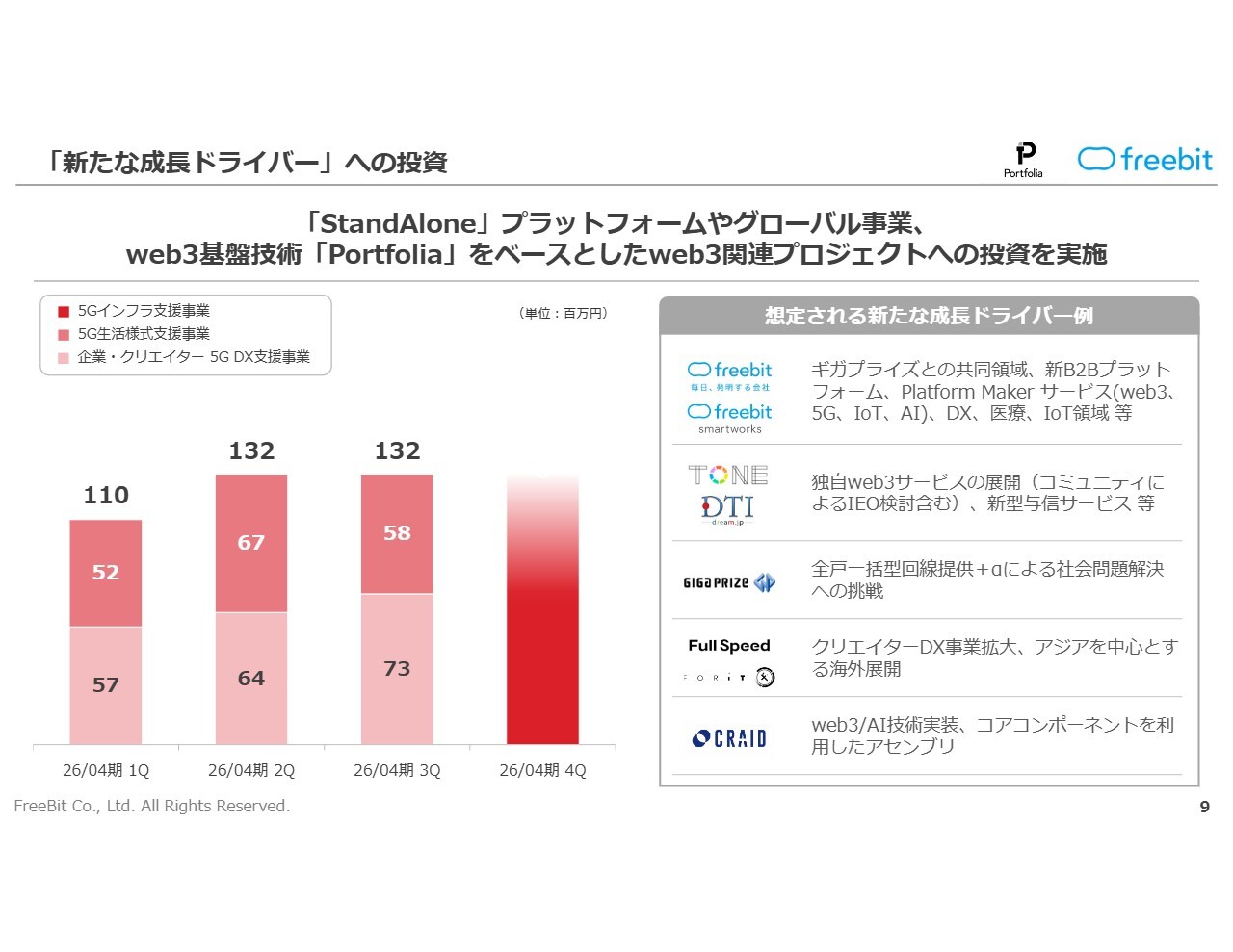 新たな成長ドライバーへの投資についてです。先ほど具体的な進捗状況でもお伝えしたとおり、「StandAlone」プラットフォームやグローバル事業、web3基盤技術の「Portfolia」をベースとしたweb3関連プロジェクトへの投資を実施しています。