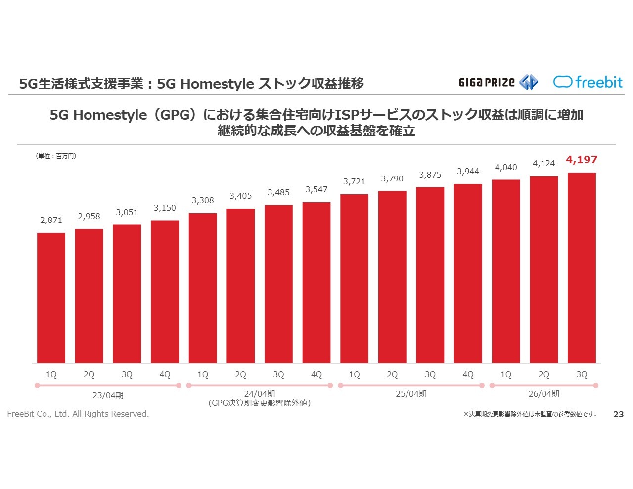 5G生活様式支援事業は、株式会社ギガプライズ(以下、ギガプライズ)の集合住宅向けISPサービスにおいて提供戸数が順調に増加し、増収となっています。