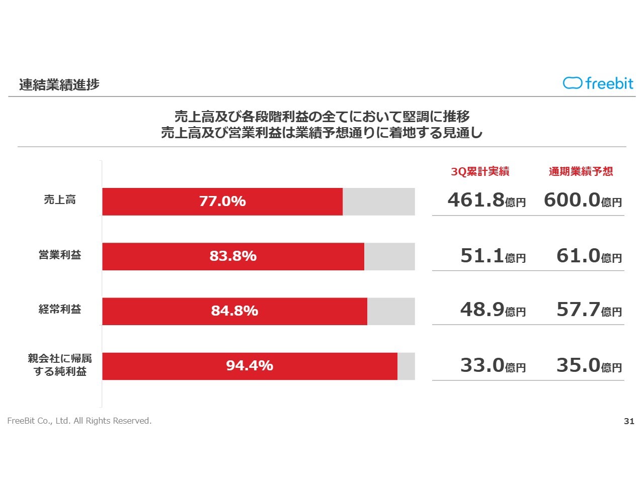 これを踏まえた結果、親会社株主に帰属する四半期純利益は前年同期比30.7パーセント増の33億300万円で着地しています。