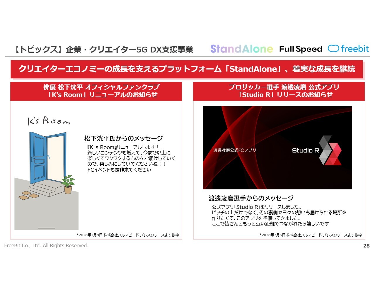 同時並行で案件も進捗しており、俳優・松下洸平のオフィシャルファンクラブ「K's Room」の案件を獲得しました。また、プロサッカー選手・渡邊凌磨の公式アプリ「Studio R」の案件も獲得し、リリースしています。