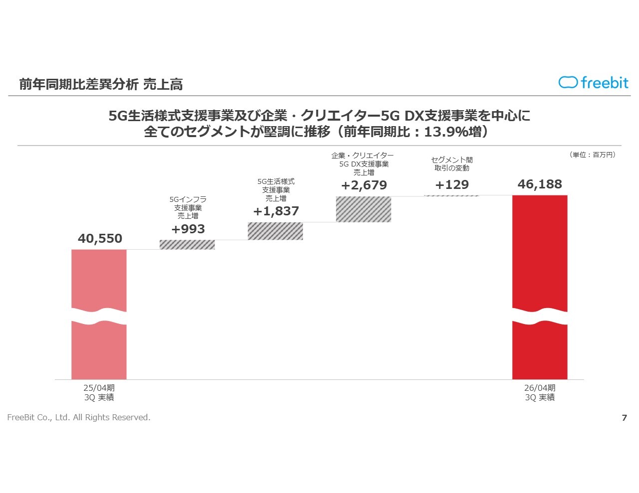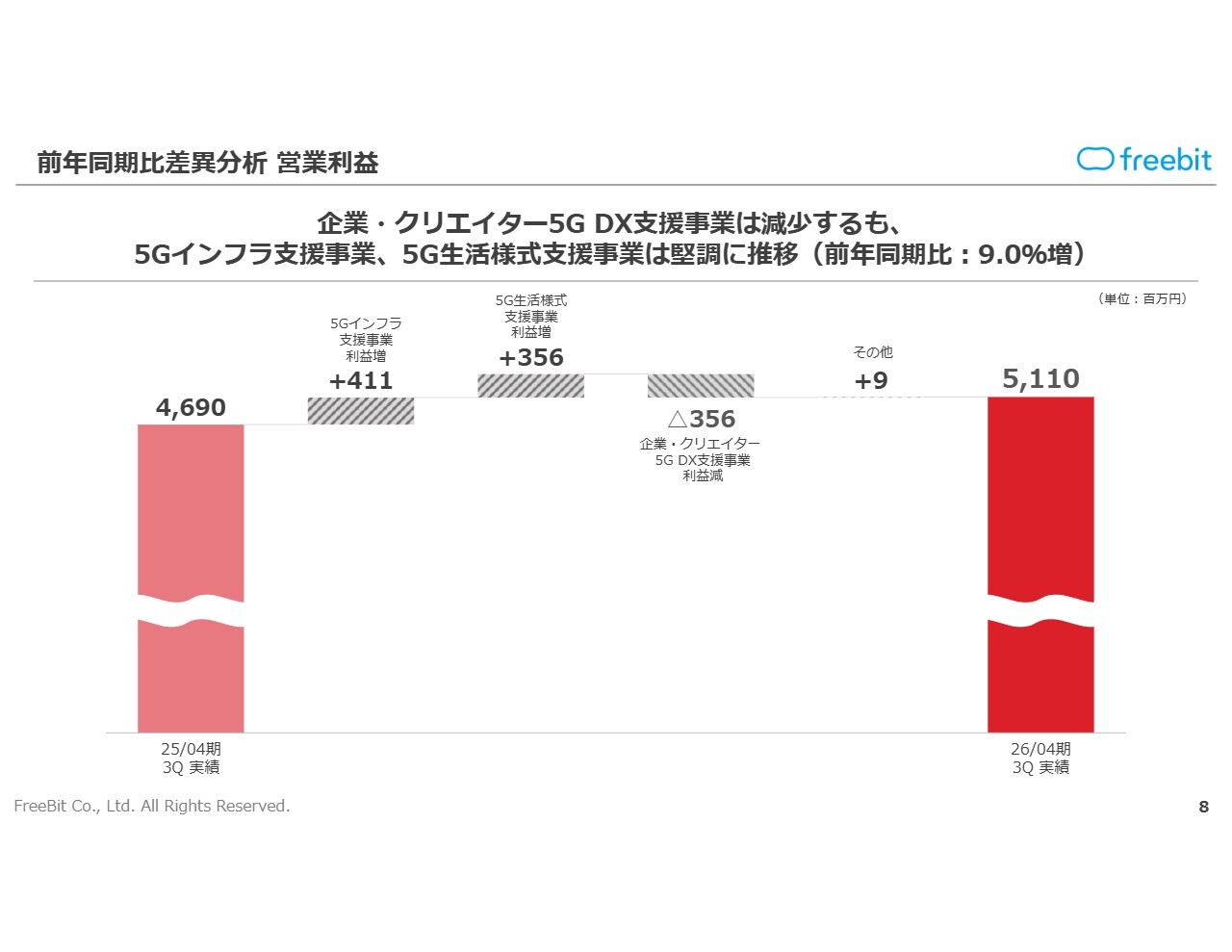 営業利益は、企業・クリエイター5G DX支援事業では前年同期比で減少しましたが、5Gインフラ支援事業および5G生活様式支援事業は順調に推移し、前年同期比9.0パーセント増の51億1,000万円で着地しました。