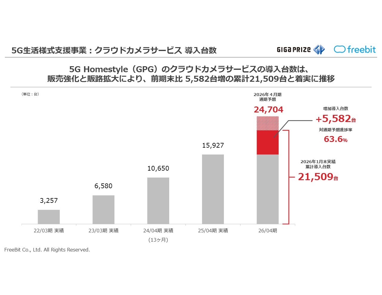 ギガプライズでは、通信サービスだけでなく、IoTサービスやセキュリティ商材の販売も強化しています。今回、クラウドカメラサービスの導入台数を初めて開示しました。1月末現在での導入台数は、2万1,509台です。前期末から5,582台増加しており、着実に推移していると考えています。