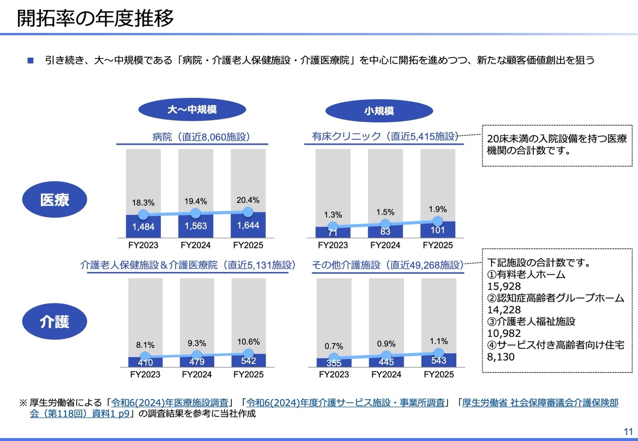 開拓率の年度推移です。主な営業先である大規模から中規模の医療施設については、スライド左上のグラフに示しているとおり、開拓率が20パーセントを超えました。また、病院に次いで優先度の高い介護老人保健施設と介護医療院の開拓率は、スライド左下のグラフで示しているとおり、10パーセントを超えました。