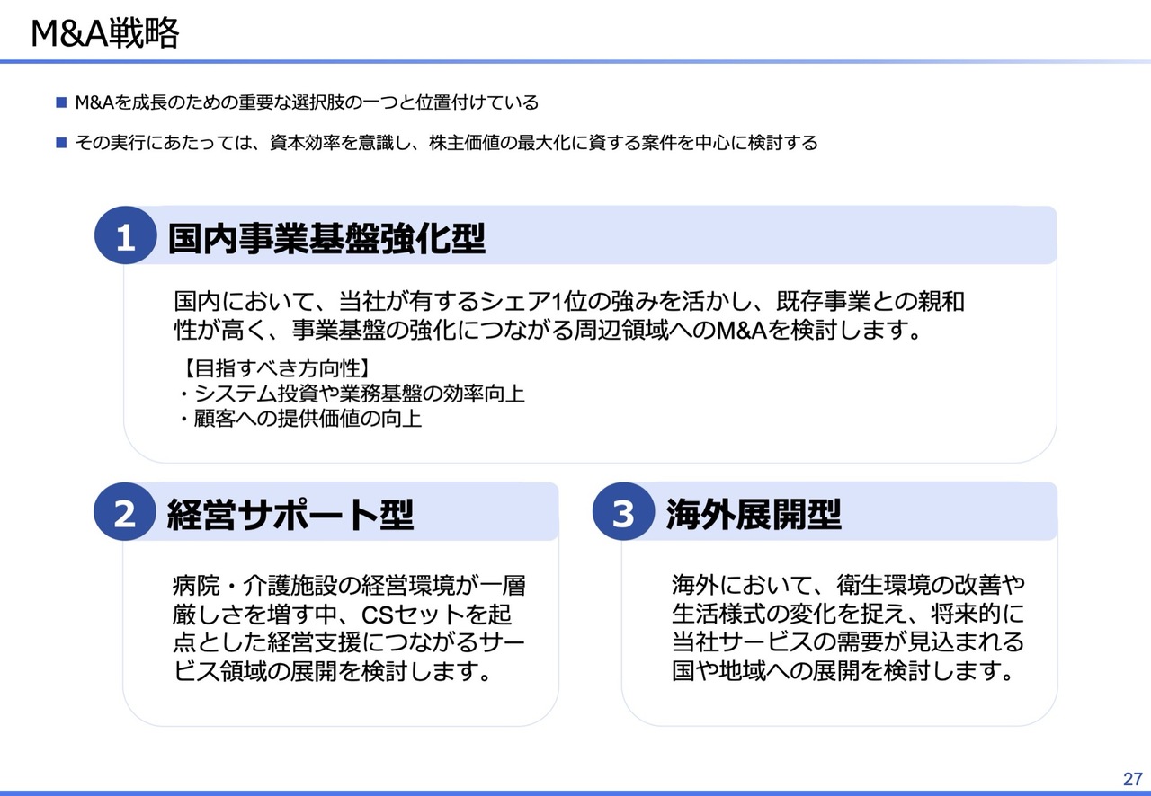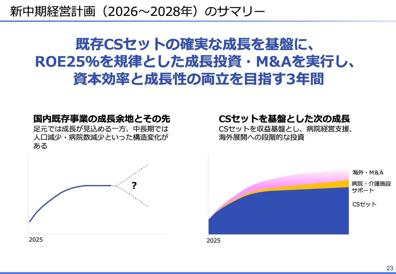 2つ目は、新中期経営計画についてです。2026年から2028年までの新中期経営計画期間においては、資本コストや株価を意識した経営方針を明確化しました。また、「CSセット」の安定成長を基盤として、病院経営支援事業の推進、海外展開、M&Aの実施を目指します。
