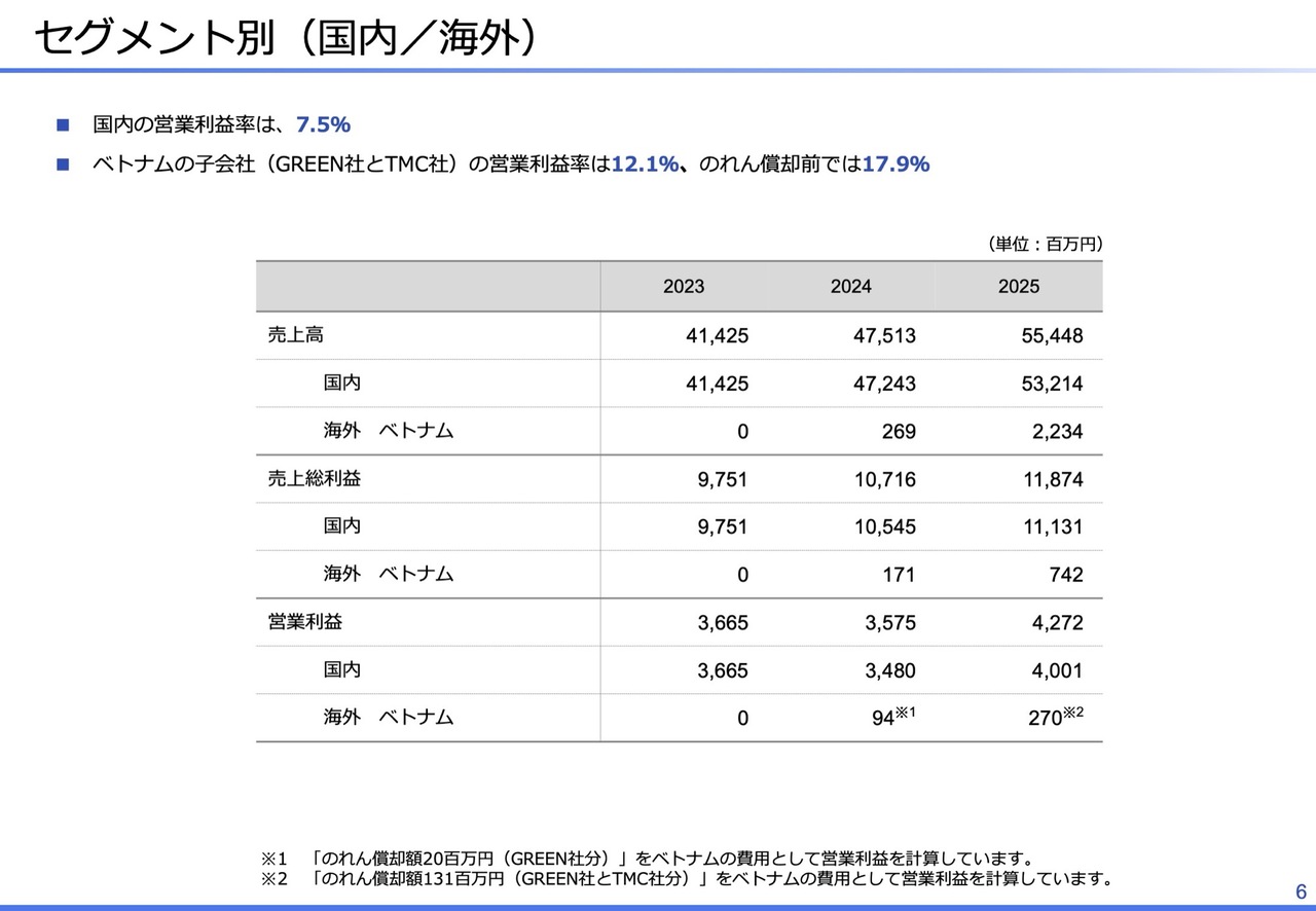セグメント別の売上高と利益です。ベトナムの欄に記載している数値は、GREEN社とTMC社の2社分です。なお、のれん償却費約1億3,000万円をベトナムの費用として営業利益を計算しており、のれんを加味してもベトナムは営業利益で黒字となっています。