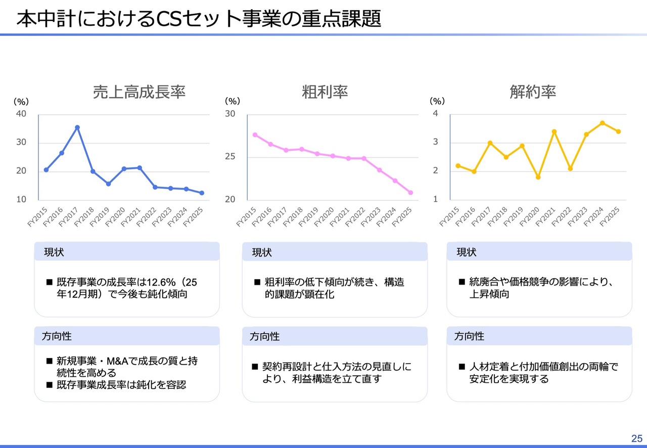 本中期経営計画では、CSセット事業の立て直し、および成長と収益性の両立を実現することを最優先で取り組んでいきます。