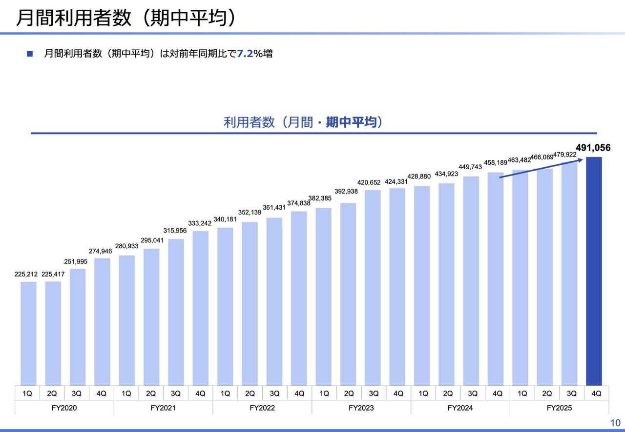 月間利用者数の推移です。契約施設数が前年同期比10.1パーセント増加した一方で、利用者数の伸びは7.2パーセント増にとどまり、1施設当たりの利用者数は減少しています。