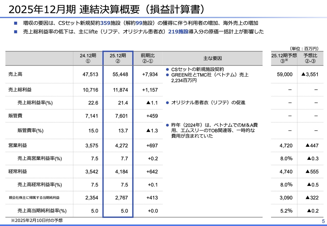 売上総利益率低下の主な要因は、お客さま満足度の向上、施設、お客さまのファン化、解約阻止を目的に2023年から導入を開始したオリジナル患者衣「lifte(リフテ)」が、2025年には219施設に導入されたことによるものです。