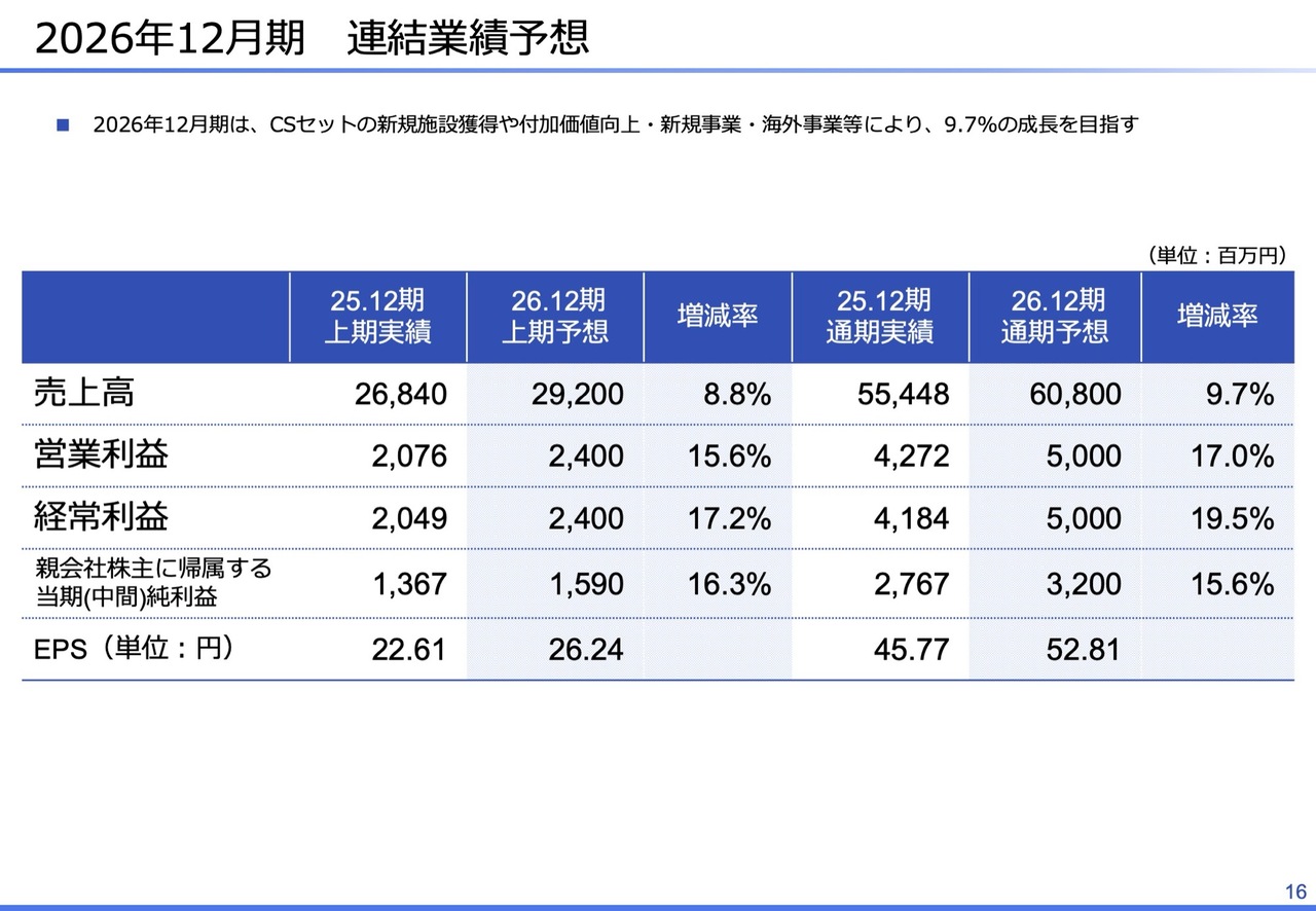 2026年12月期の業績予想についてご説明します。まず、2026年12月期の連結業績予想です。2026年12月期は、「CSセット」の新規施設獲得や付加価値向上、新規事業、海外事業等により、売上高において9.7パーセントの成長を目指します。