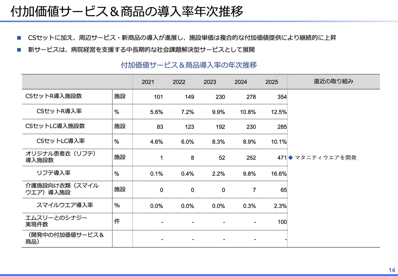 付加価値サービスと商品導入率の年次推移です。「CSセットR」の導入施設数は354施設で、既存施設全体に対する導入率は12.5パーセントと徐々に伸びています。「CSセットLC」についても、導入施設数が徐々に増加しています。