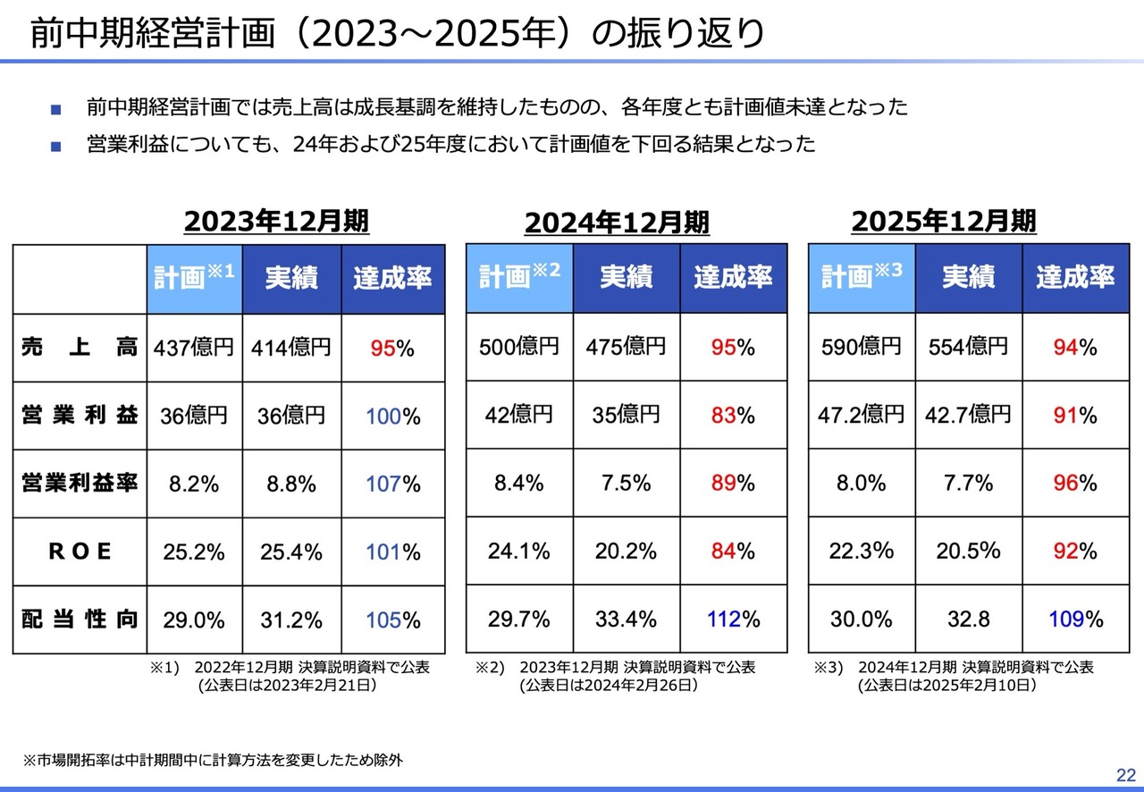 ここからは、新中期経営計画についてご説明します。前中期経営計画では、売上高・利益ともに計画未達となりました。その背景には、外部環境や競争環境の変化を十分に織り込めていなかったことに加え、人の力に依存したやや強めの計画設定を行っていた点が挙げられます。
