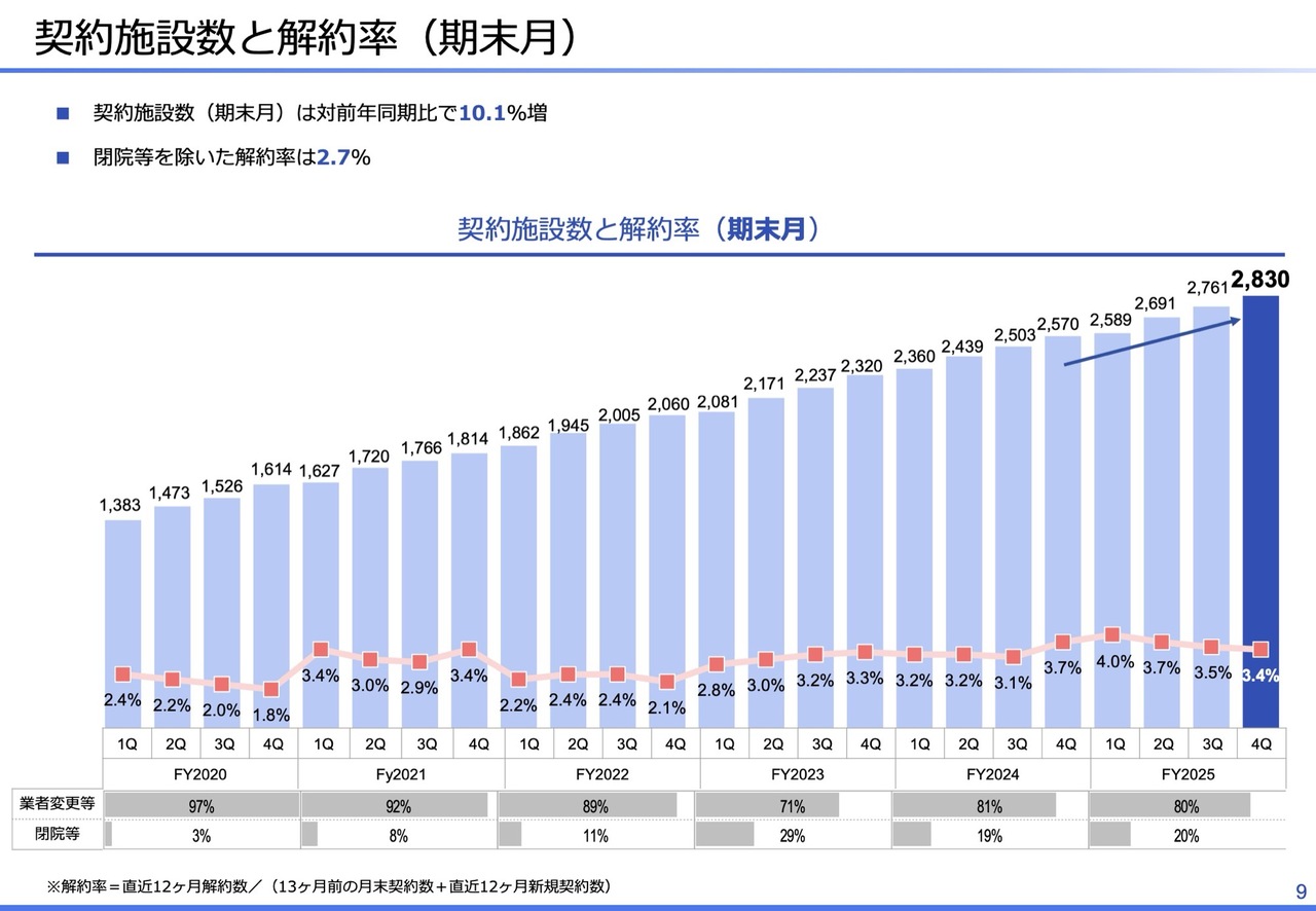契約施設数と解約率の推移です。契約施設数は2,830施設で、前年同期比10.1パーセント増加しました。解約数は99施設で、解約率は3.4パーセントと若干低下しています。また、閉院等を除いた解約率は2.7パーセントです。
