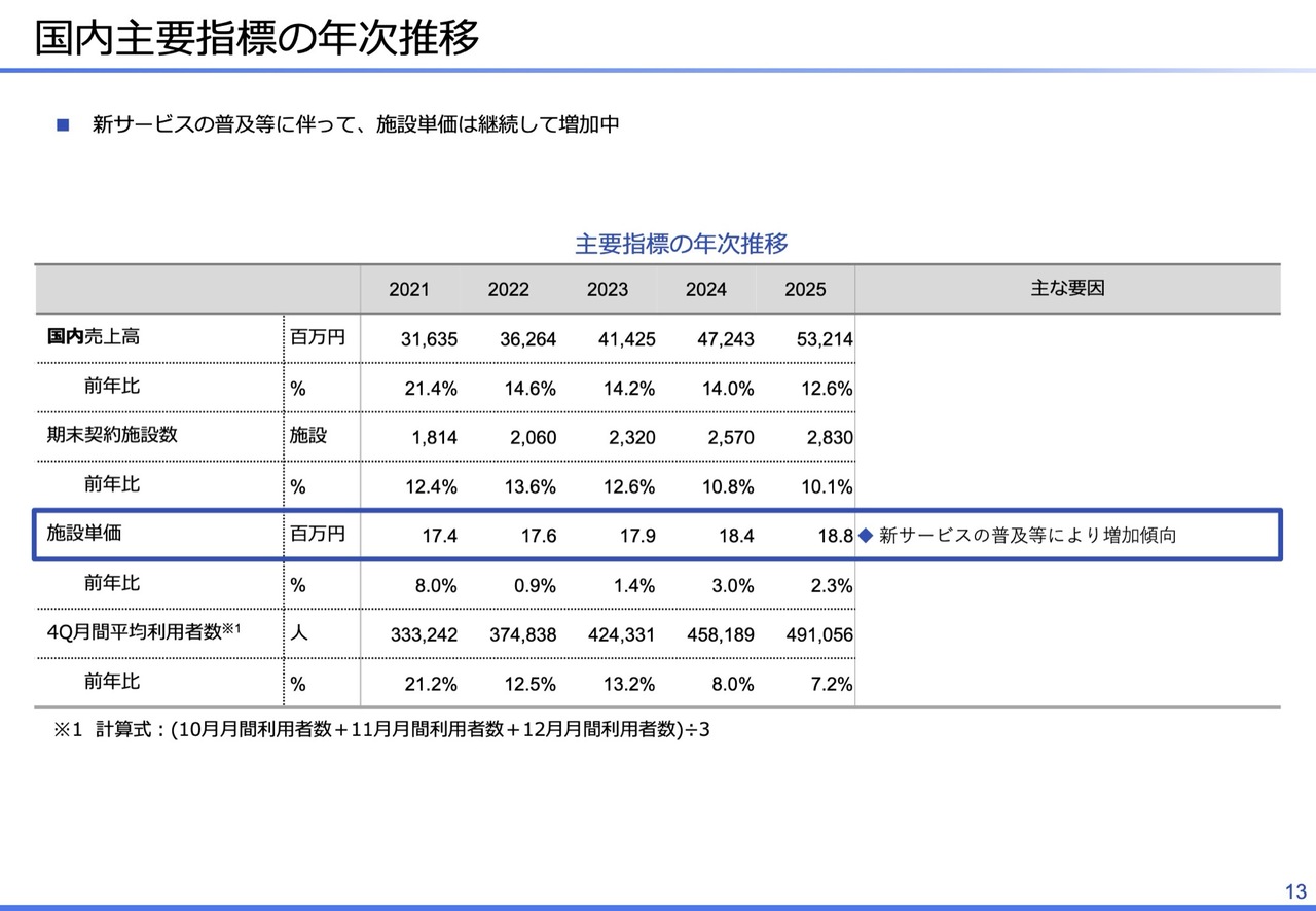 国内主要指標の年次推移です。2025年の国内売上高は532億1,400万円で、前年比12.6パーセントの成長となりました。期末契約施設数は2,830施設で、前年比10.1パーセントの成長です。国内売上高を施設数で割った施設単価は1,880万円と、年々増加しています。その要因については、次のスライドをご覧ください。