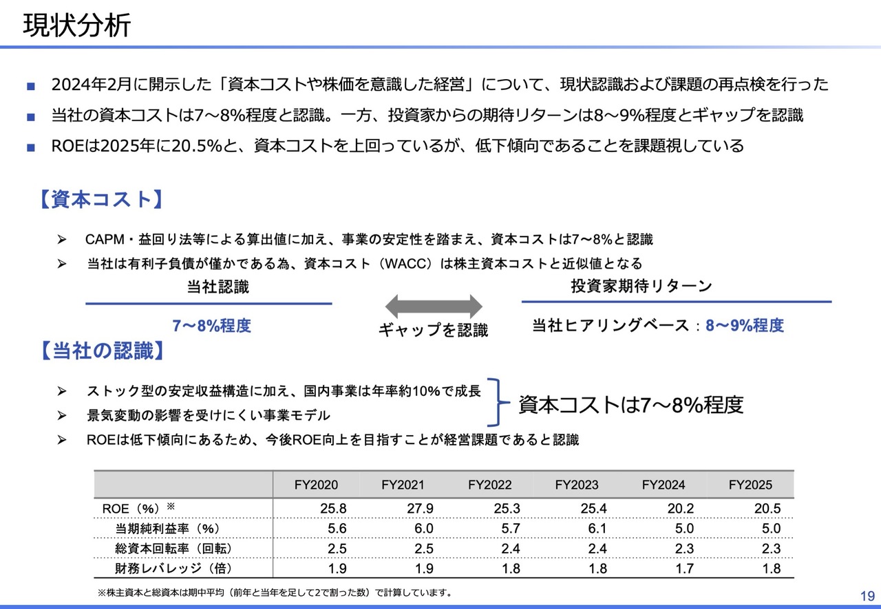 この点について、当社の事業特性を簡単に整理します。当社はストック型のビジネスモデルを基盤としており、国内事業は年率約10パーセントで成長しています。また、景気変動の影響を受けにくく、比較的安定した収益構造を有しています。このような特性を踏まえ、資本コストを7パーセントから8パーセントという水準で見ています。