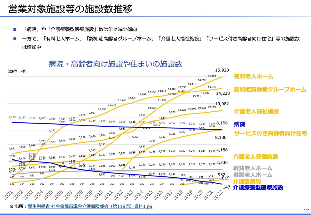 当社が営業対象としている施設数の推移です。病院や介護療養型医療施設の数は年々減少傾向にある一方で、有料老人ホームなどの介護施設が増加しています。