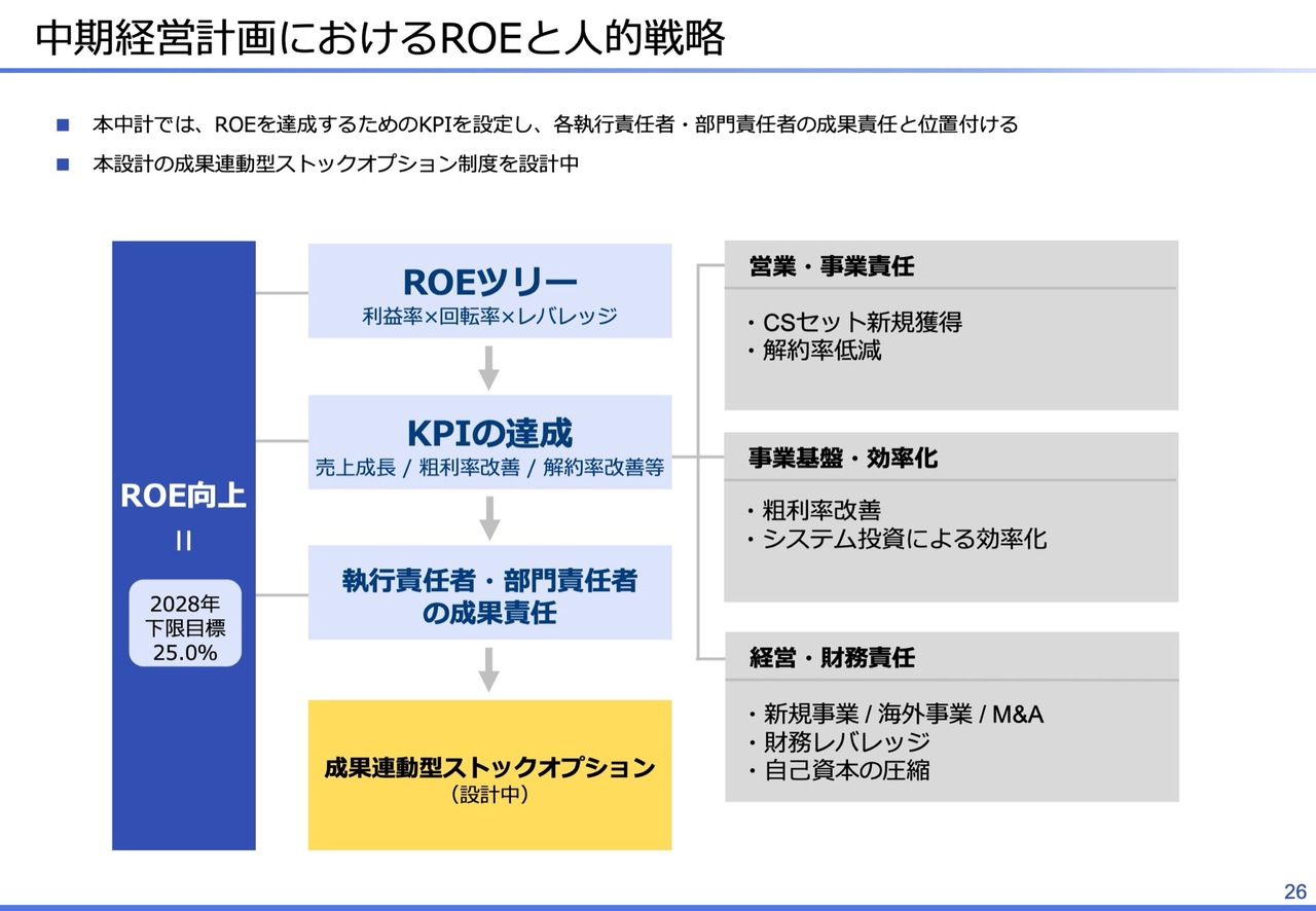 さらに、その成果が最終的に報酬に反映される仕組みとして、現在、成果連動型ストックオプションを設計しています。ベクトルを合わせてROEを高めることが、個人の成果として正しく評価される仕組みです。この中期経営計画は、戦略を描くだけではなく、実行と責任までを含めて設計しています。