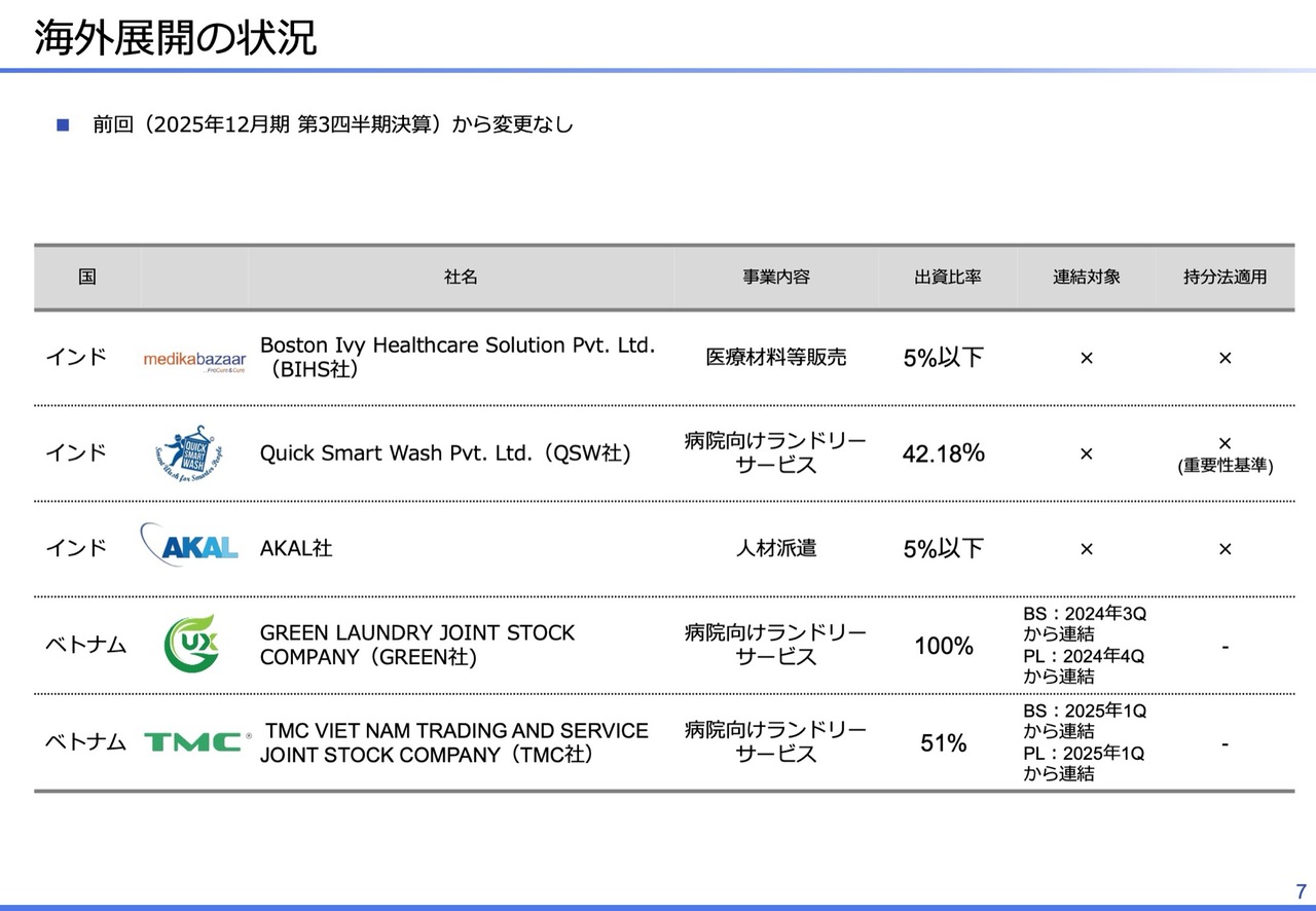 ベトナムの事業については、ハノイ市にあるTMC社とホーチミン市にあるGREEN社のどちらも、基本的にリネン事業を展開しています。今後の方向性として、「CSセット」やその他事業の可能性について、2026年はしっかりと見極めていきたいと考えています。