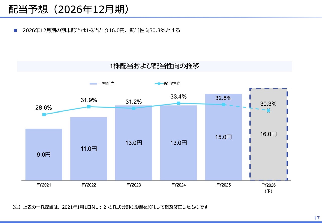 配当予想です。2025年12月期の1株当たり配当は15円で、配当性向は32.8パーセントです。2026年12月期の1株当たり配当は16円で、配当性向は30.3パーセントを予定しています。