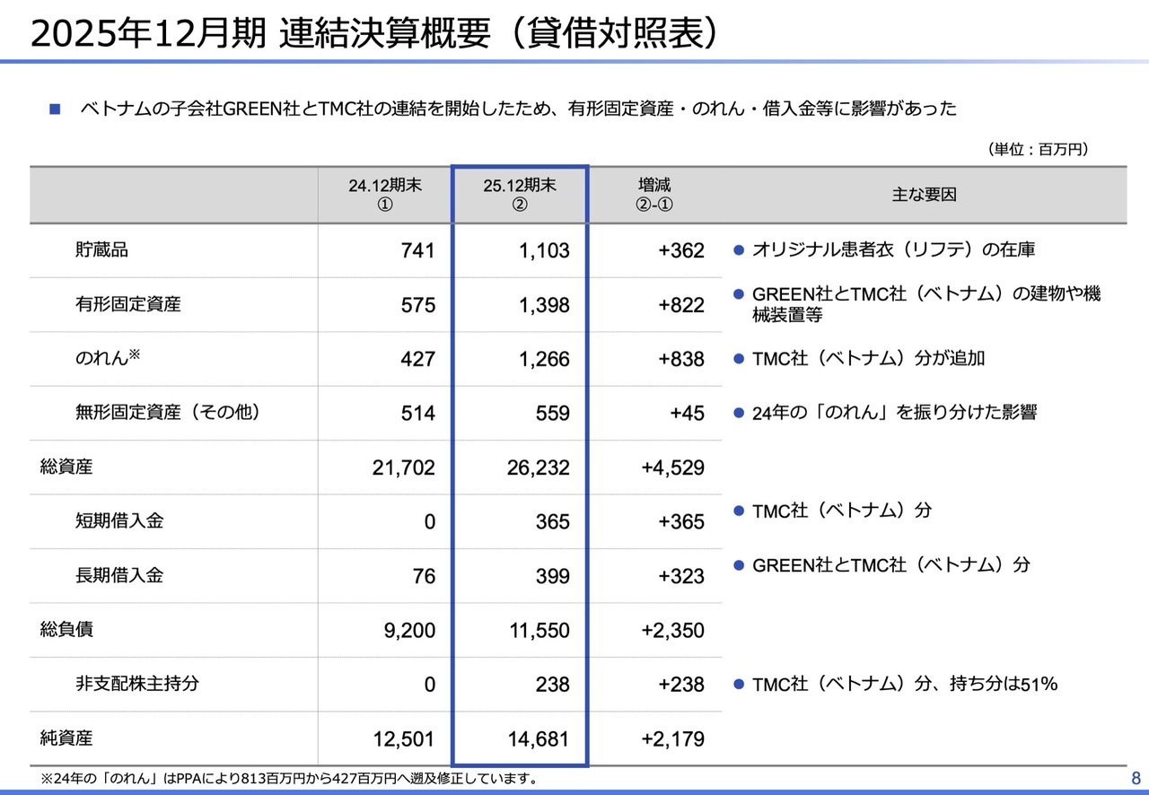 連結貸借対照表です。貯蔵品約3億6,000万円の増加は、「lifte」の自社在庫分です。また、ベトナムの子会社であるGREEN社とTMC社の連結開始により、スライドに記載のとおり、有形固定資産、のれん、借入金等に影響がありました。