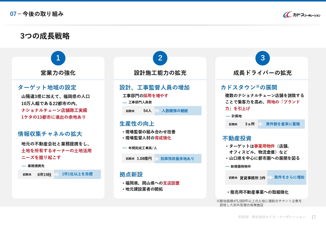 最後に「成長ドライバーの拡充」についてです。当社は、事業のさらなる成長に向けて「カドスタウン」の展開を推進しています。「カドスタウン」は、大規模な土地に複数のテナント企業を誘致する郊外型複合商業施設です。ナショナルチェーン店舗を複数誘致することで、集客力を高め、土地のブランド価値を向上させることを狙います。前期末では3ヶ所の土地計画地を確保しており、着実に案件数を積み上げています。