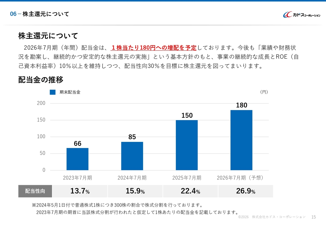 株主還元についてご説明します。年間配当金は1株当たり180円への増配を予定し、配当性向は26.9パーセントになると見通しています。