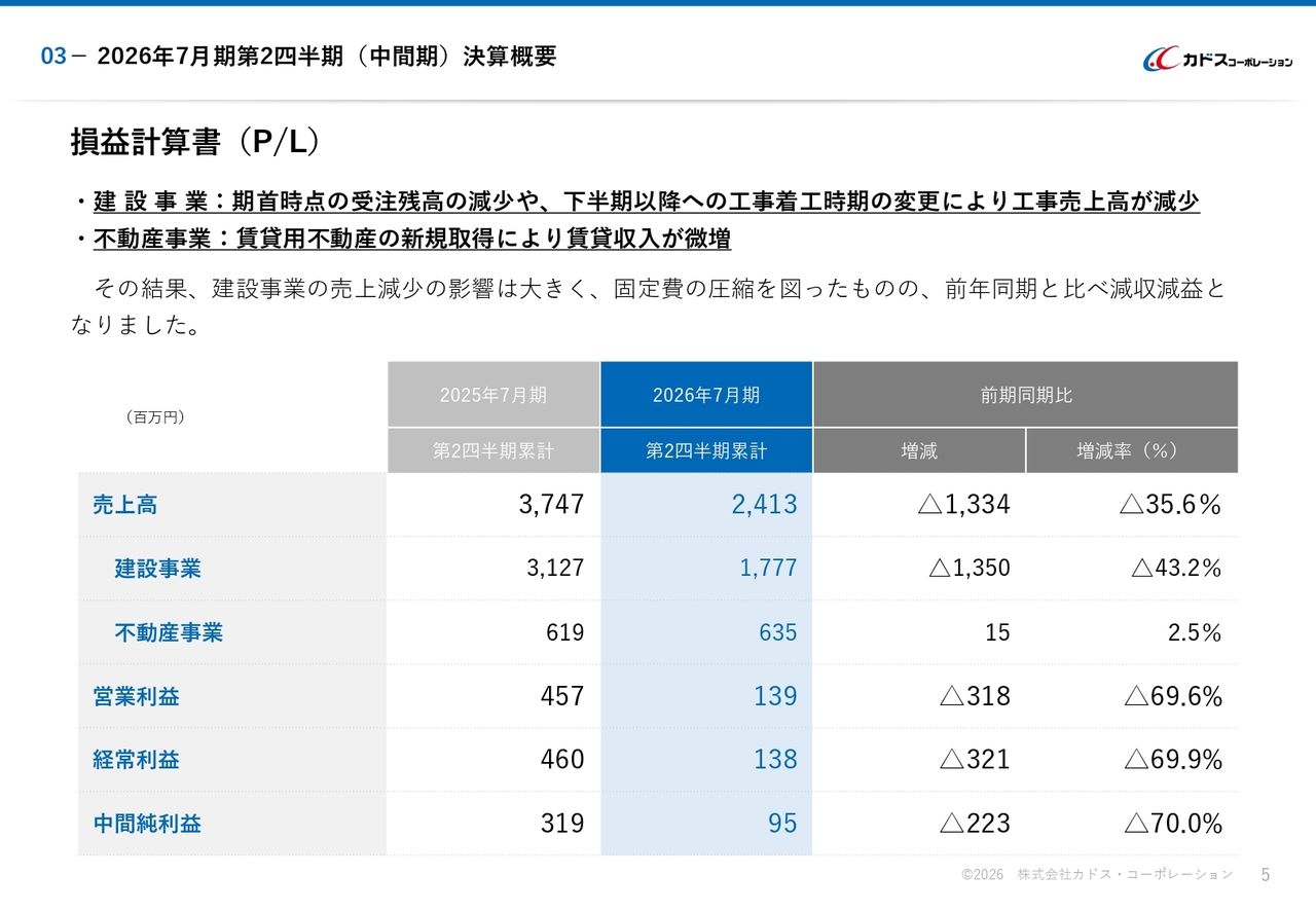 損益計算書についてご説明します。建設事業は、期首時点の受注残高の減少や、下半期以降への工事着工時期の変更により、工事売上高が減少しました。不動産事業は、賃貸用不動産の新規取得により、賃貸収入が微増しました。