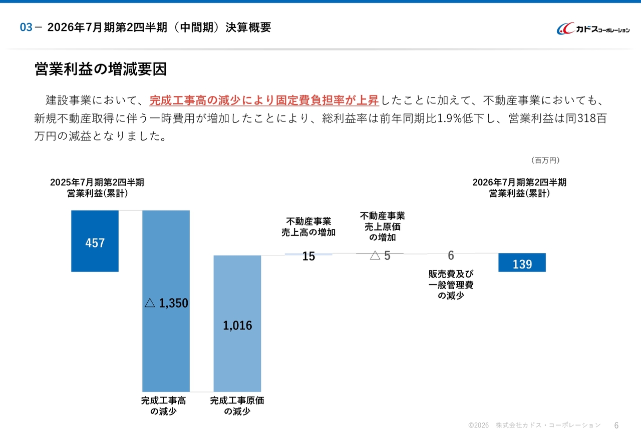 建設事業において、完成工事高の減少により固定費負担率が上昇したことに加え、不動産事業においても、新規不動産取得に伴う一時費用が増加したことにより、総利益率は前年同期比で1.9パーセント低下しました。