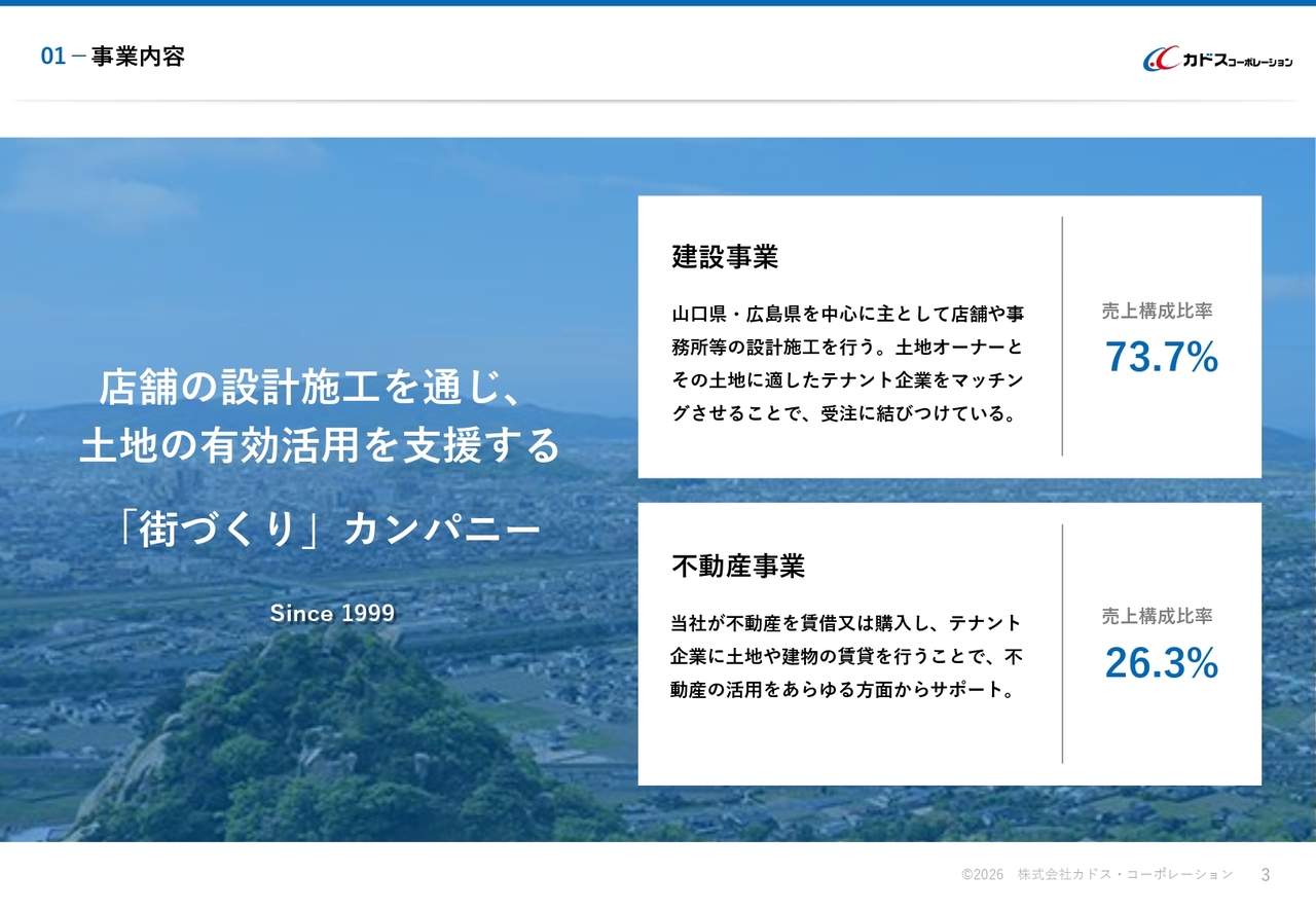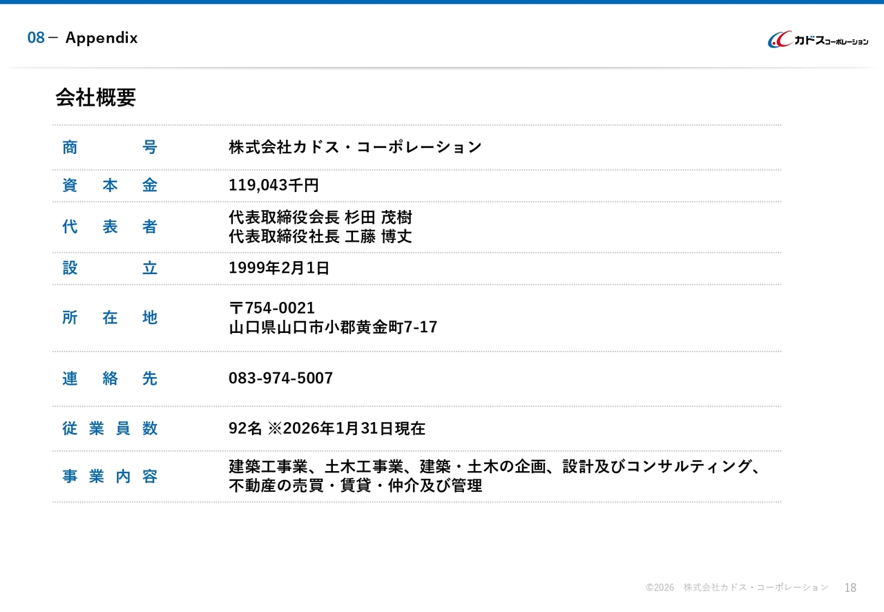 当社は、1999年2月1日に設立し、建築工事業、土木工事業、建築・土木の企画、設計およびコンサルティング、不動産の売買・賃貸・仲介および管理を主要事業としています。本社は山口県山口市に所在し、従業員数は2026年1月31日現在で92名です。