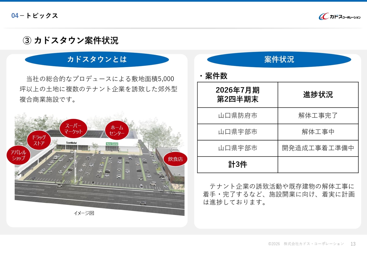 「カドスタウン」の案件状況についてご説明します。「カドスタウン」は、大規模な土地に複数のテナント企業を誘致する郊外型複合商業施設です。