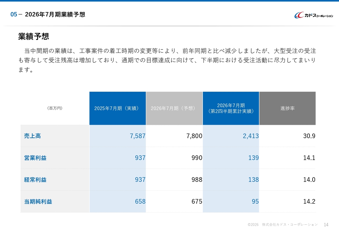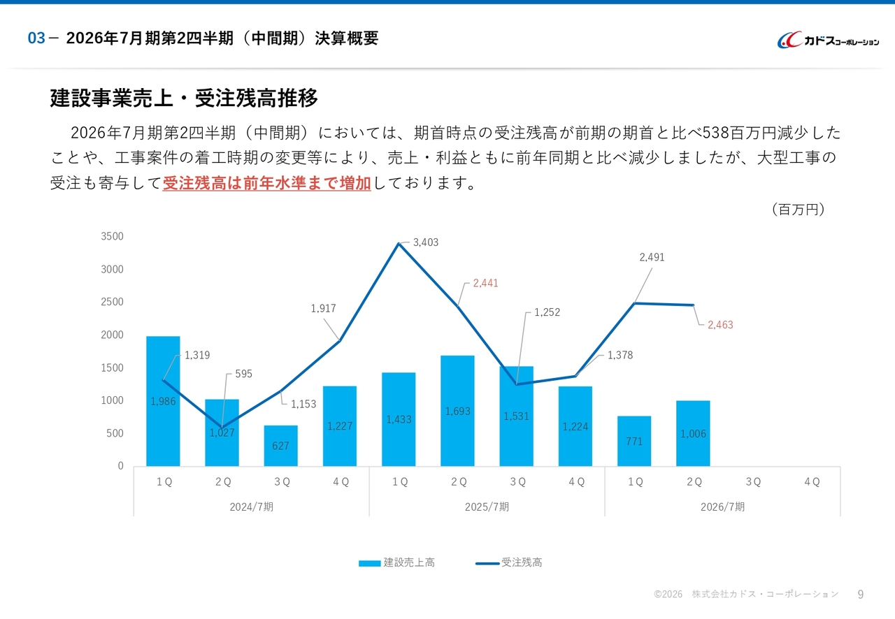 スライド下部のグラフもご参照ください。棒グラフが建設売上高、折れ線グラフが受注残高を示しています。受注残高は、2025年7月期末の13億7,800万円から、2026年7月期第2四半期(中間期)は24億6,300万円となっています。