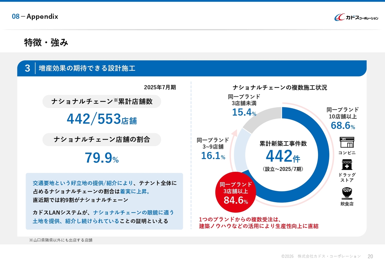 3点目は、「増産効果の期待できる設計施工」になります。当社は、ナショナルチェーン店舗の施工を多数手掛けており、前期末までの累計新築工事件数は442件に達しており、全体の約80パーセントを占めています。直近期では、当社が手掛けた新築工事の約9割がナショナルチェーン店舗となっており、交通要地への出店に貢献しています。