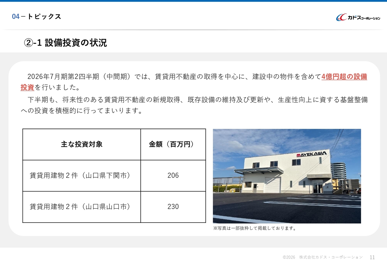 下半期も、将来性のある賃貸用不動産の新規取得、既存設備の維持および更新、生産性向上に資する基盤整備への投資を積極的に行います。