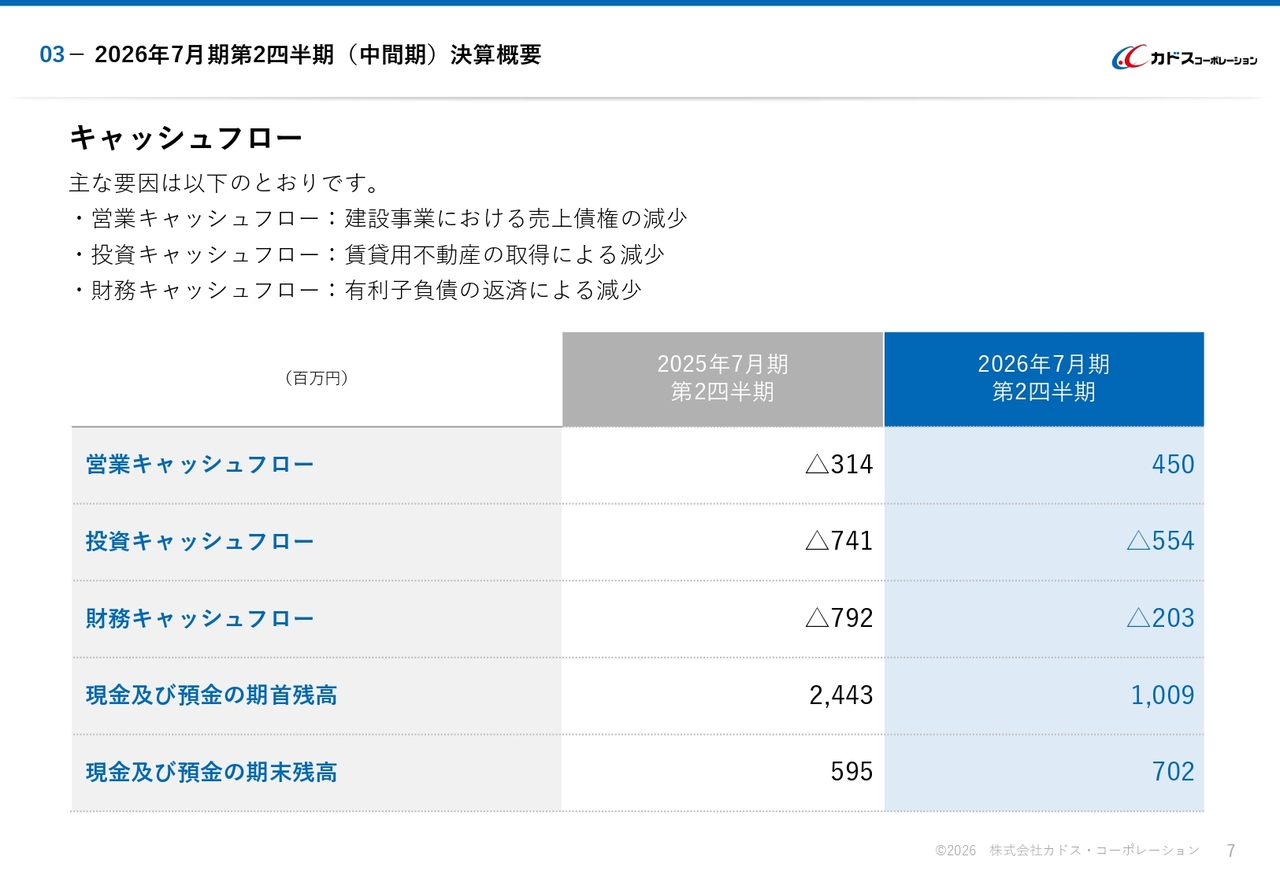 2026年7月期第2四半期(中間期)決算概要 キャッシュフロー