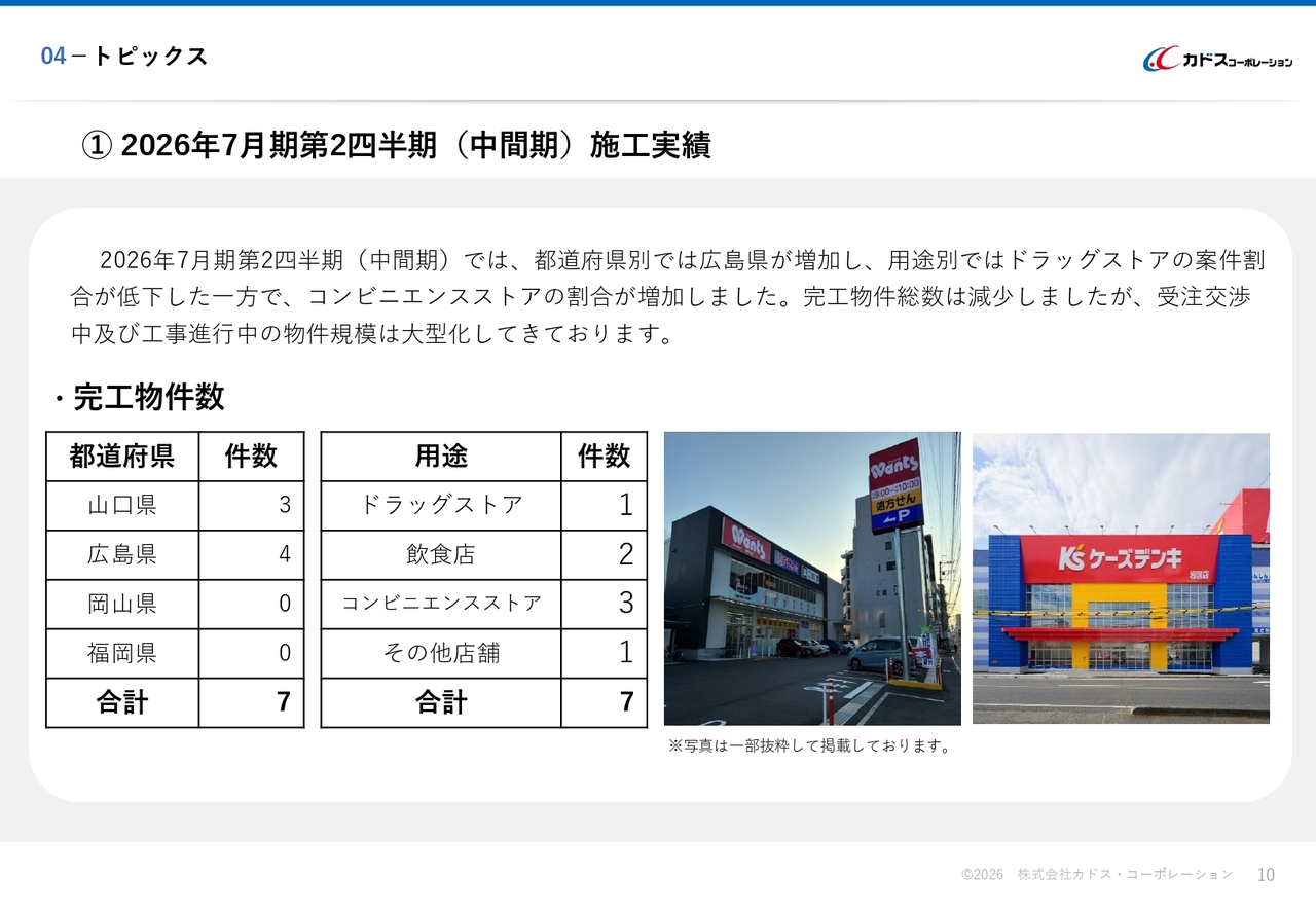 2026年7月期第2四半期(中間期)は、広島県における完工件数が増加した一方で、用途別ではドラッグストアの割合が低下し、コンビニエンスストアの割合が増加しました。