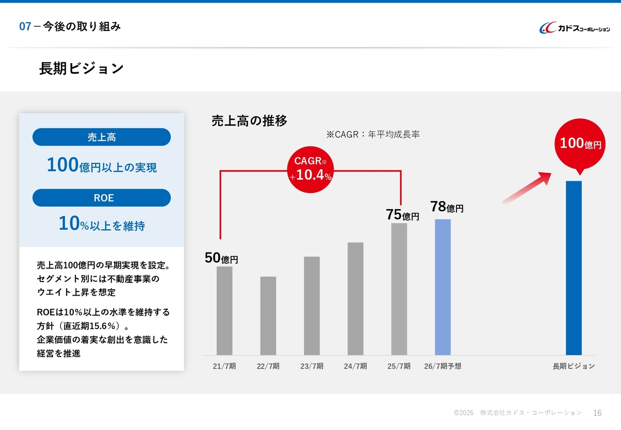 当社の長期ビジョンについてご説明します。売上高については、100億円以上の早期実現を目指しています。2025年7月期の実績は75億円で、2021年7月期からの年平均成長率は10.4パーセントです。2026年7月期の売上高は78億円を計画しています。