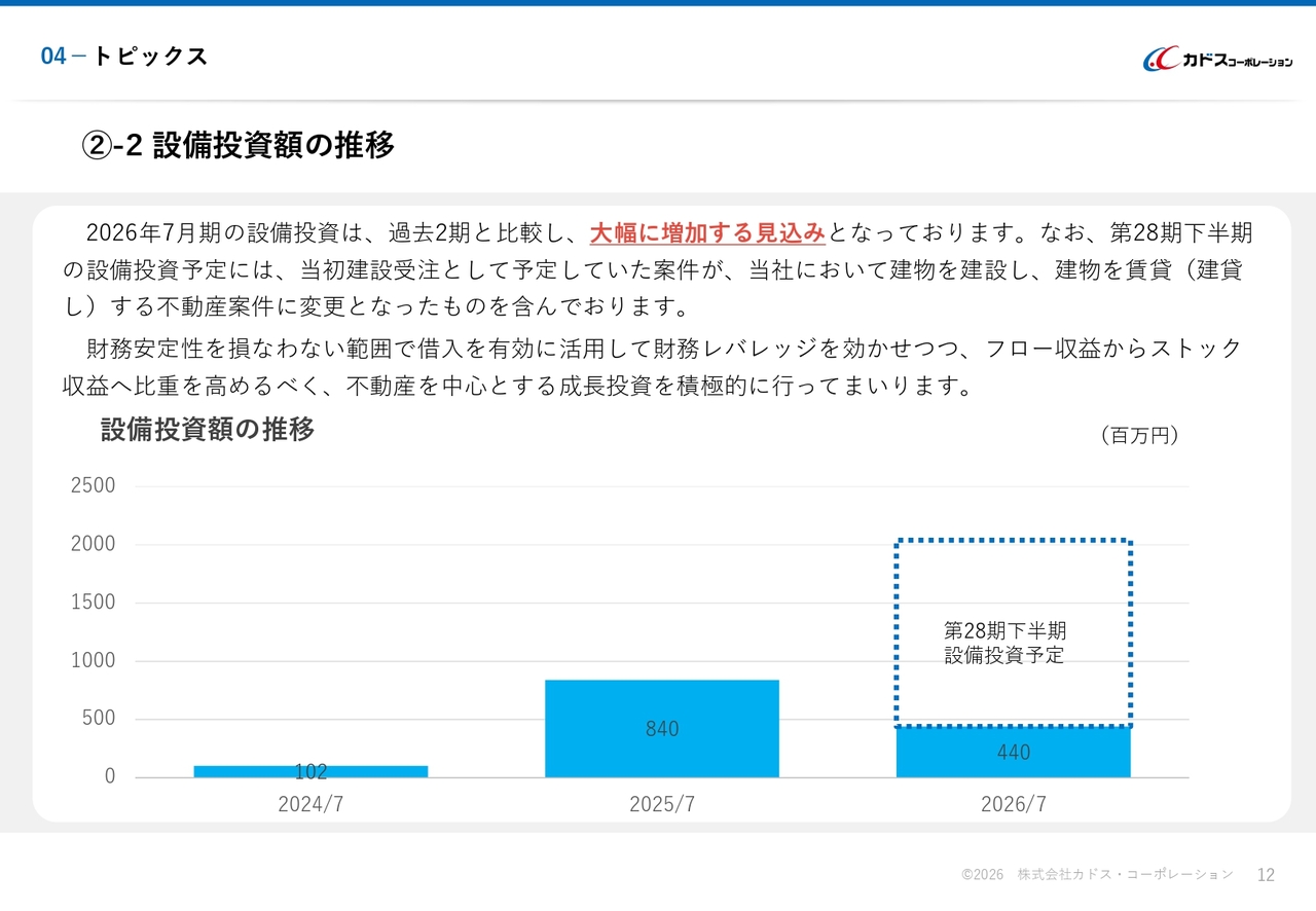 2026年7月期は、第2四半期終了時点ですでに4億4,000万円を投じていますが、下半期の設備投資計画を含めると、過去2期と比較して大幅に増加すると見込んでいます。