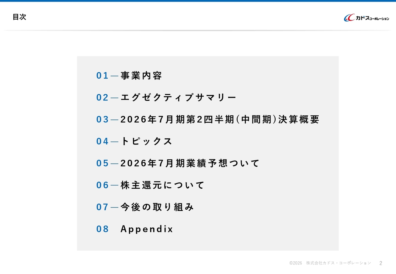 工藤博丈氏:代表取締役社長の工藤です。2026年7月期第2四半期(中間期)決算説明を行います。本日は、まず当社の事業内容、エグゼクティブサマリー、2026年7月期第2四半期(中間期)決算概要、トピックスについてご説明します。