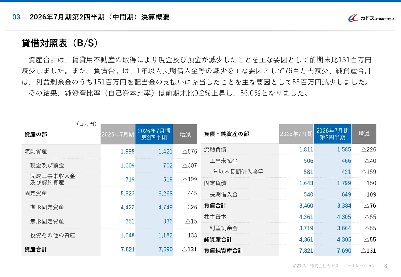 2026年7月期第2四半期(中間期)決算概要 貸借対照表(B/S)
